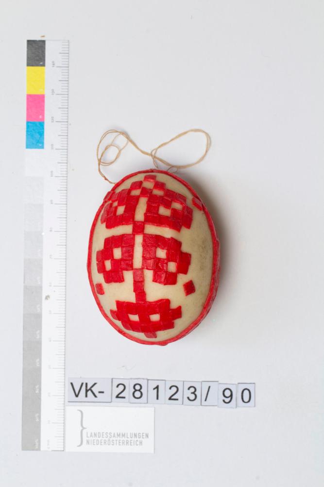 Kunststoffei, umwickelt mit Wachs in weiß, Musterung: aus Wachs in rot geschnittene Quadrate aufgeklebt in Art der Kreuzstickerei, Motiv: Herz mit Blume und Kreuz, Sternblume; schmales Wachsband rot zwischen Vorderseite und Rückseite
