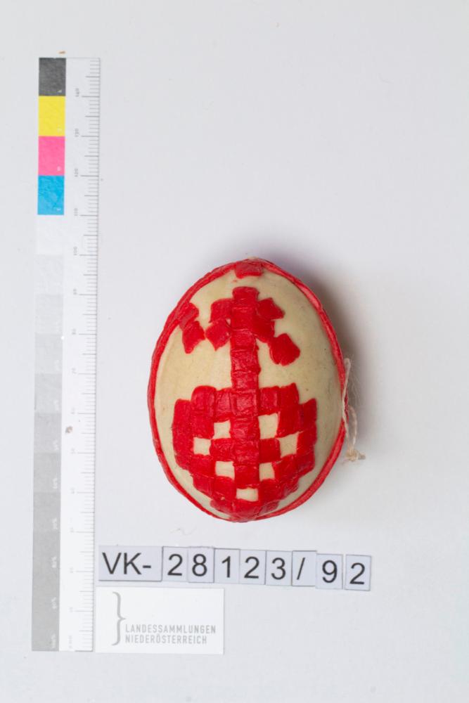 Kunststoffei, umwickelt mit Wachs in weiß, Musterung: aus Wachs in rot geschnittene Quadrate aufgeklebt in Art der Kreuzstickerei, Motiv: Herz mit Blume; schmales Wachsband rot zwischen Vorderseite und Rückseite
