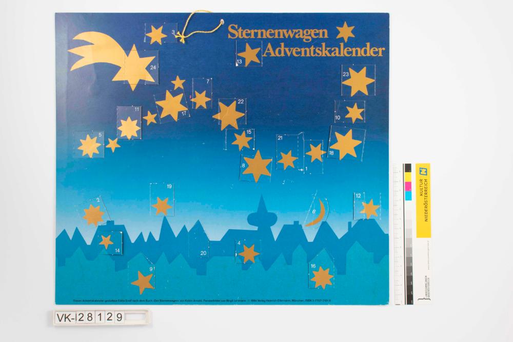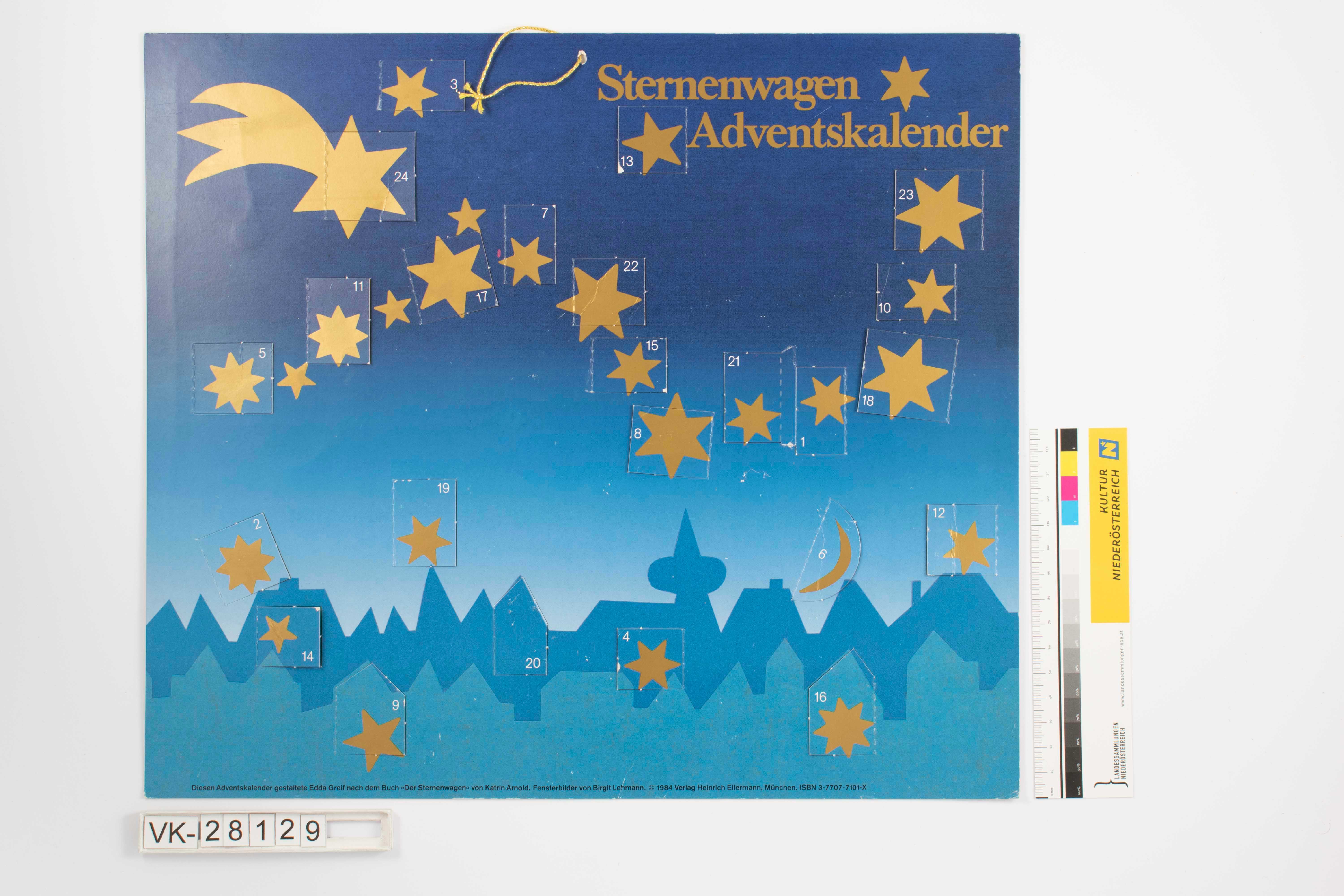 Hängeadventkalender, Querformat mit goldenen Sternen auf mittel- bis dunkelblauem Hintergrund; im unteren Bilddrittel ein in unterschiedlichen Blautönen gehaltenes Stadtmotiv; gestanzte, viereckige und hausförmige Türchen; rechts oben goldene Beschriftung: Sternenwagen Adventkalender, unten Beschriftung mit dem Hinweis dass der Adventkalender von Edda Greif nach dem Buch „Der Sternenwagen“ von Katrin Arnold und die Fensterbilder von Birgit Lehmann gestaltet wurden; Verlag Heinrich Ellermann, München 1984.
