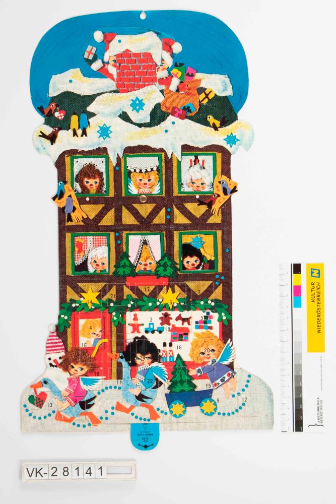 Beweglicher Hängeadventkalender in Form eines Fachwerkhauses; mit einer Lasche kann der Weihnachtsmann hinter dem Kamin bewegt werden; aus den Fenstern und vor dem Haus sind Engelchen und Gänse; Türchen im unteren Drittel des Kalenders; oben mittig gestanzte Aufhängeöse; auf der Lasche Beschriftung samt Herkunftsangabe und Nummer 6815.