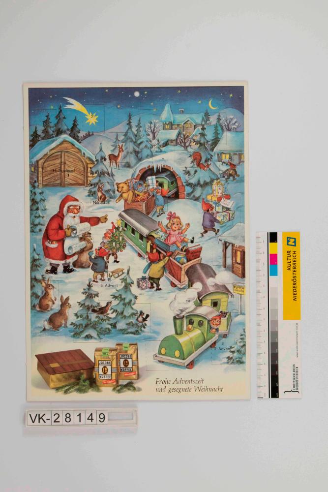 Hängeadventkalender, Hochformat mit winterlichem Landschaftsmotiv und Eisenbahn; Dampflokomotive und Zug mit Spielsachen, Wichtel und Weihnachtsmann, verschneite Nadelbäume und Tiere, im Hintergrund winterliches Dorf unter Sternenhimmel; oben mittig Lochung, viereckige Türchen; unten mittig Werbung für Kaffee der Firma Jacobs sowie Weihnachtswünsche.