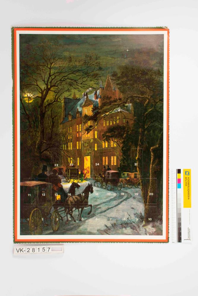 Adventkalender in Hochformat mit winterlicher, abendlicher Abbildung eines Herrenhauses mit mehreren vorfahrenden Kutschen, Bild in rot-weiß-dunkelgrün umrahmt; viereckige Türchen; auf der Rückseite ausführliche Informationen zum Motiv und Herkunftsangabe.