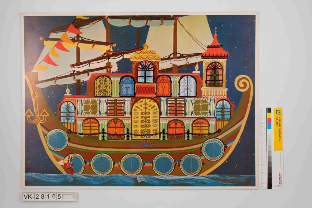 Hängeadventkalender, Querformat mit doppelter Lochung am oberen Rand; Motiv einer Arche / eines Schiffes mit buntgoldenen Türchen, dahinter biblische Szenen; Bild von Renate Schwarzer (Adventschiff), daher vermutlich Veritas Verlag.