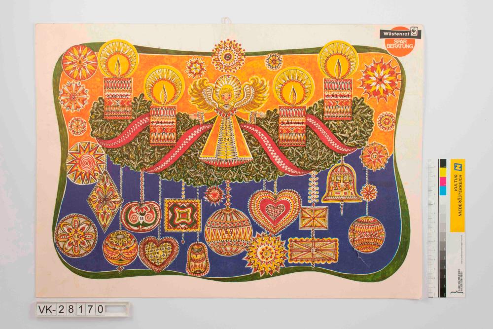 Adventkalender, Querformat, mit Adventkranz- und Christbaumschmuckmotivik; vier brennenden Kerzen und grüne, gewellte Bildumrahmung; oben mittig auf Rückseite verklebte Aufhängeschnur; Werbeprodukt der Firma Wüstenrot, Firmenlogo rechts oben.