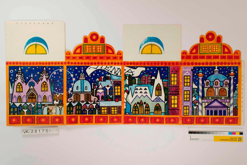 Stelladventkalender zum Selberbasteln in Form eines vierseitigen Hauses mit Stadtmotiv, „Vienna“; Doppelflügelfenster mit Bibelszenen dahinter; Künstlersignatur Jirka 69, vermutlich Sven Jirka.