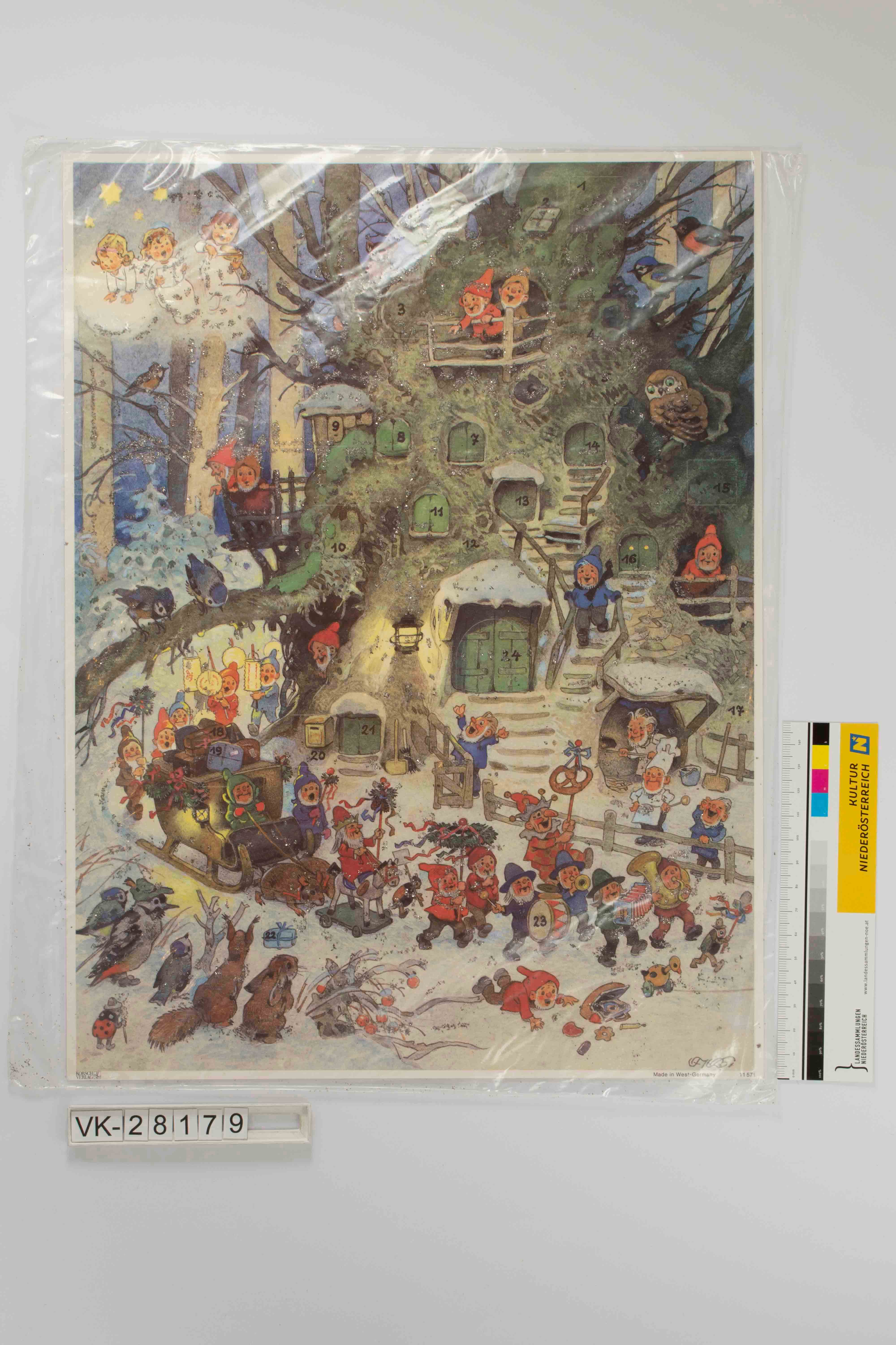 Hängeadventkalender, Hochformat mit Weihnachtswichtelmotiv, ein Zug musizierender Wichtel vor von Mäusen gezogenem Schlitten mit Geschenken und Wichteln mit Laternen,dahinter Baumhaus mit Tor und Fenstern und weiteren Wichteln sowie im Hintergrund Waldtiere und singende Engel; unten jeweils links und rechts Herkunftsangaben, Künstlersignatur sowie Nummer 11571.