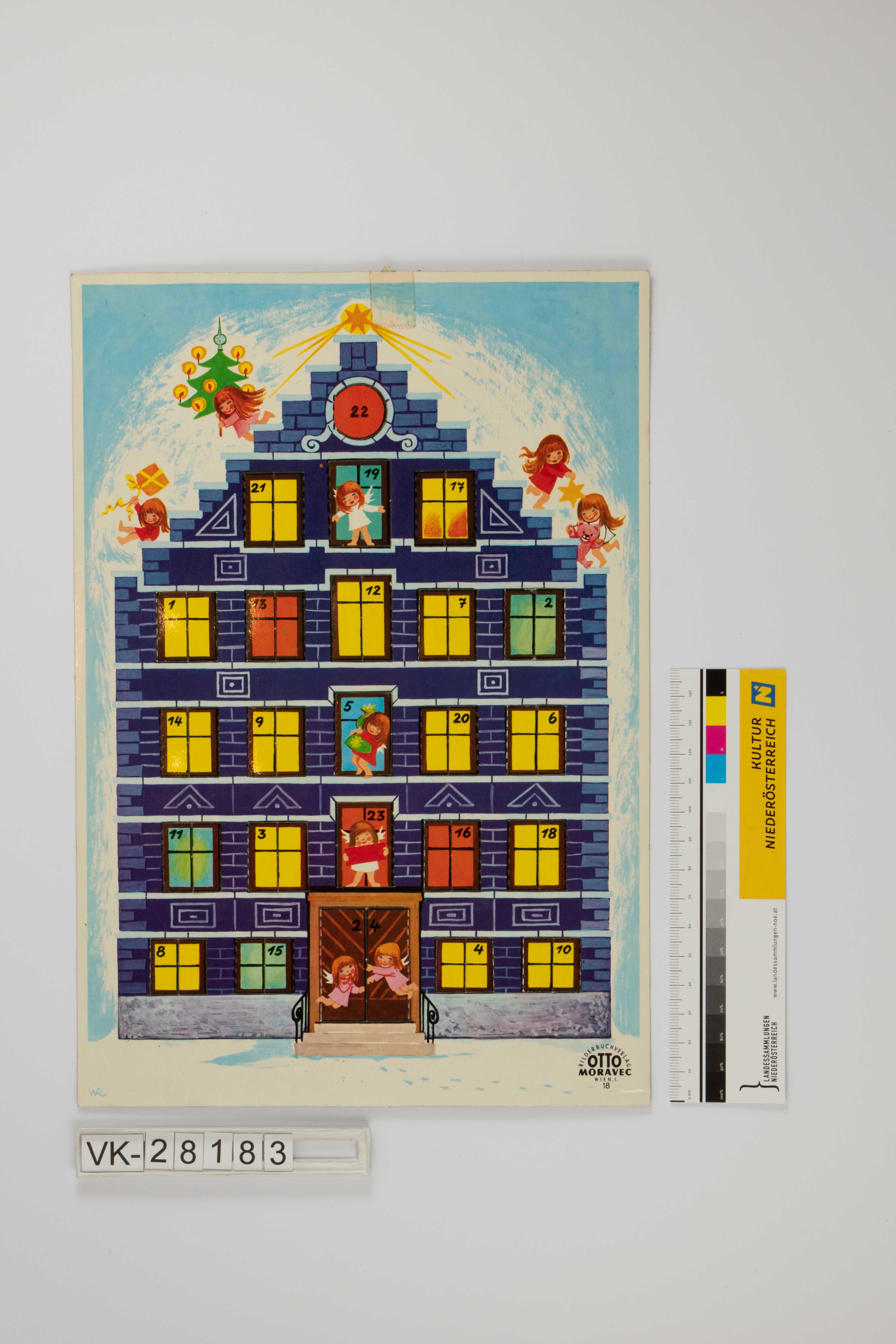 Adventkalender, Hochformat, Hochglanz; Haus mit 5 Etagen und Zinnendach umrahmt durch fliegende Engel; bunt beleuchtete Fenster sind die Adventkalendertürchen; rechts unten Verlags- und Herkunftsangabe mit Nummer 18.