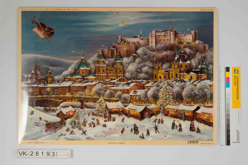 Hängeadventkalender, Querformat mit Abbildung der Stadt Salzburg mit Sehenswürdigkeiten, im Vordergrund historischer Adventmarkt (19. Jhd) mit Eislaufplatz und schifahrenden Menschen; links oben im Bild Geige mit Noten und rechts unten Signatur von Isabell Kirmse; unterschiedlich geformte Türchen sowie oben mittig Aufhängelochung; in der weißen Umrahmung Verlagsangaben, Beschriftung auf chinesisch sowie Bestellnummer und Kontakt.