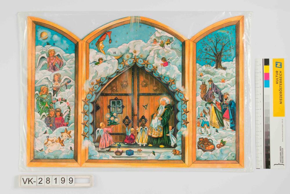 Fünfflügeliger Aufstelladventkalender als Bogengerüst in den Wolken, mittig auf der Front blauer Spitzbogen mit Sternenornament und Holztor mit Fenster, davor Petrus mit Schlüssel und Engelchen, darüber in den Wolken Mond mit Mütze und musizierende Engel, auf den weiteren Flügeln Engelsszenen und Dreikönigsszene sowie Weihnachtsmann; links unten Herkunftsangabe, rechts unten Nummer 453; Maße in verpacktem Zustand, geöffnet ca. 20,5x44,5.