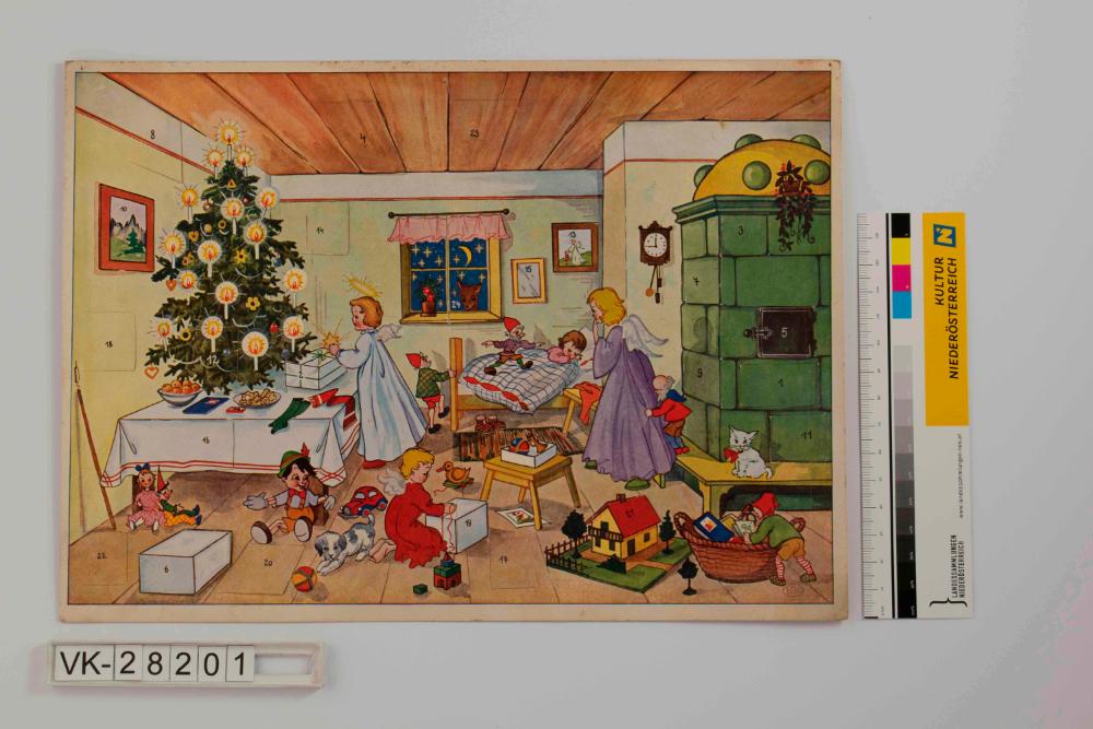 Adventkalender, Querformat, mit häuslicher Weihnachtsszene in Zimmer mit Kachelofen und Gabentisch mit Christbaum, schlafendem Kind und drei Engelchen welche Geschenke verpacken; rechts unten Herkunftsangabe.