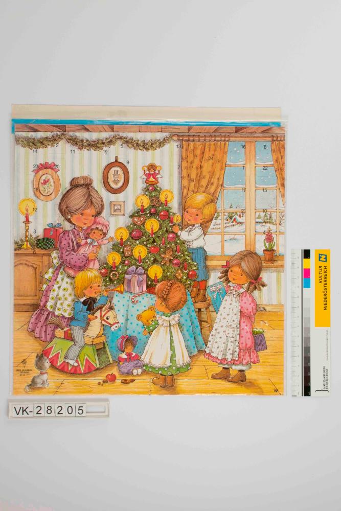 Dreidimensionaler Aufstelladventkalender mit einer Familie rund um den Christbaum in einem Zimmer, ein Bub zündet die Kerzen an, ein anderer sitzt auf einem Schaukelpferd, durch ein Fenster Blick auf verschneite Winterlandschaft; quadratische Türchen, unten links Verlagsangaben und Nummer 80 10-1.