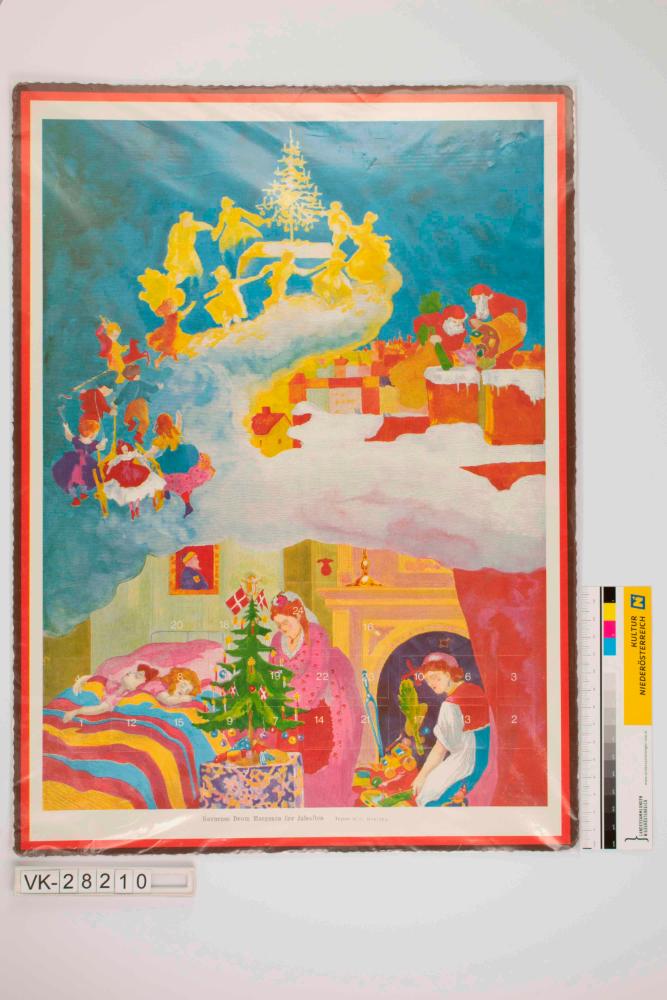 Adventkalender, Hochformat mit gewelltem Rand und einem Bild von Broling auf welchem Mutter und Dienstmädchen den Christbaum schmücken während zwei Kinder daneben schlafen, in der oberen Bildhälfte ist der Traum der Kinder dargestellt; unten Bildbeschriftung, rückseitig Erläuterungen zum Bild und Weihnachtsglückwünsche sowie Herstellerangaben; Nummer 1359.