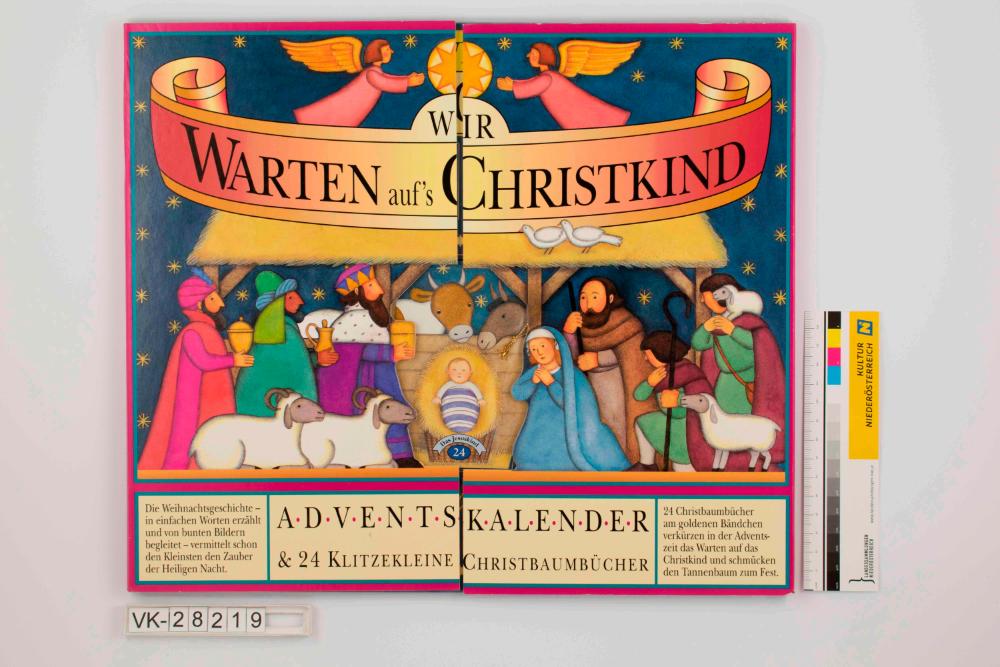 Aufstelladventkalender in Form eines Triptychons mit kleinen Büchern als Christbaumanhänger zum Entnehmen; in geschlossenem Zustand auf der Vorderseite Krippendarstellung mit den Heiligen Drei Königen und zwei Engeln und der Überschrift Warten auf’s Christkind sowie kurze Beschreibung; in geöffnetem Zustand auf dem linken Flügel Karte des Heiligen Landes und auf dem rechten Flügel ein Lied mit Noten; mittig 24 kleine Fächer mit Büchern zu bestimmten adventlichen, biblischen Themen; jedes Büchlein hat eine goldene Aufhängeschnur; rückseitig Erläuterungen und Herkunftsangaben.