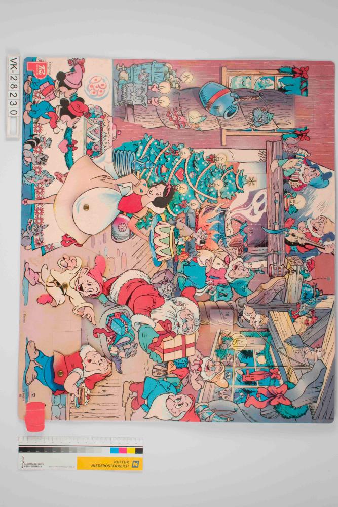 Dreidimensionaler Hängeadventkalender mit Schokolade, Querformat; oben mittig zwei Aufhängelochungen; Schneewittchen-Motiv von Disney, Weihnachtsfest mit Christbaum in einem Zimmer, rundherum feiernde Zwerge, Waldtiere, Mickeymäuse und andere Disney-Figuren sowie ein Weihnachtsmann der die Geschenke verteilt; rechts unten Lasche mit der Schneewittchen und zwei Zwerge bewegt werden können, Türchen im rechten oberen Viertel des Bildes angeordnet, dahinter Schokoladefach; unten Beschriftungen mit Herstellerangaben, Werbeprodukt für Pea Schokolade, Nummer 11 9060-1.