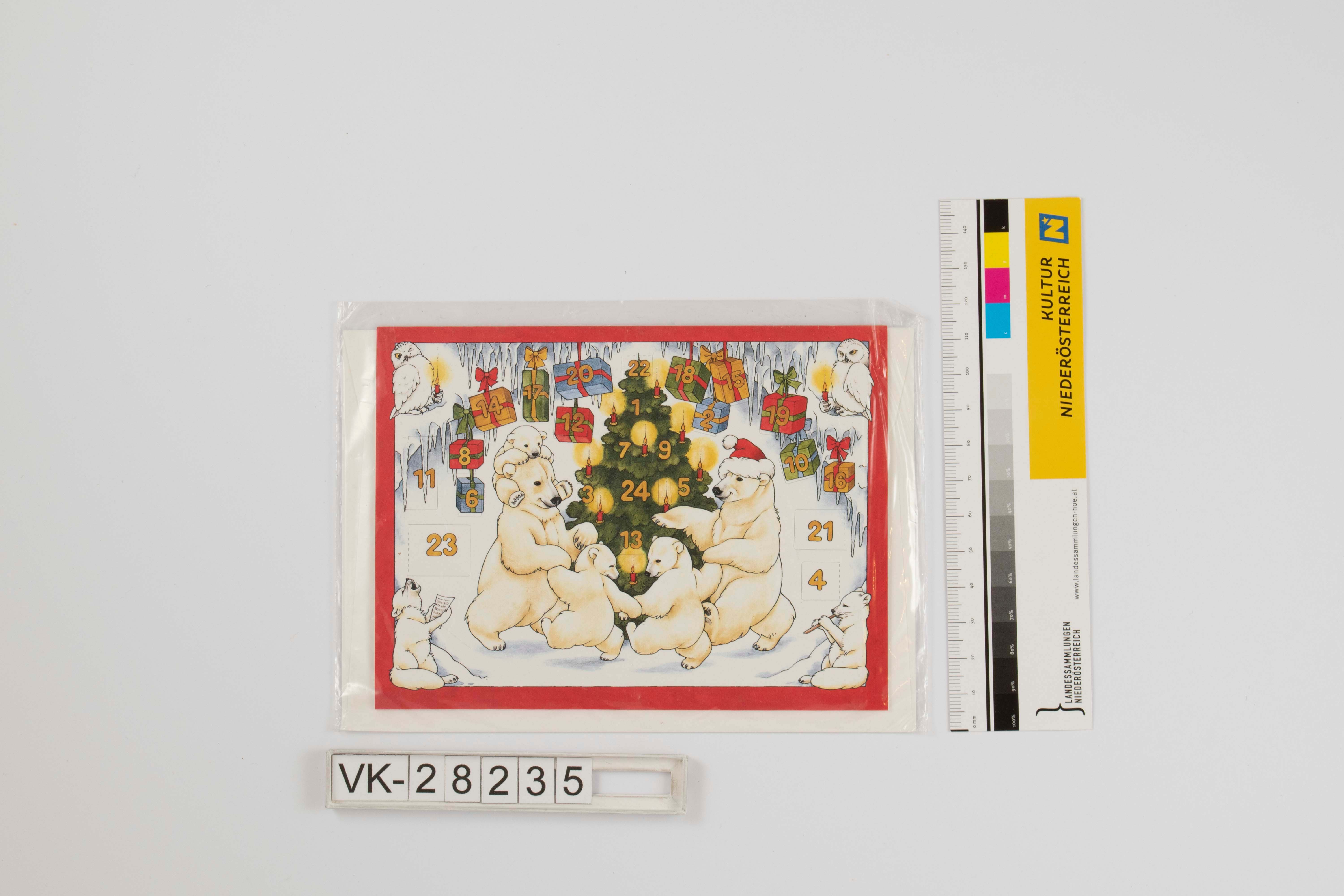 Adventkalender in Postkartenformat mit beigelegtem Kuvert; Die Eisbärengrotte ( Bild von Sara Ball); rot umrahmtes Bild mit um einen Christbaum tanzenden Eisbären und fliegenden Geschenken sowie singendem Polarfuchs im Vordergrund links; lang- und querrechteckige Türchen, rohweißes Kuvert; rückseitig Herkunftsangaben, gedruckt in Deutschland.