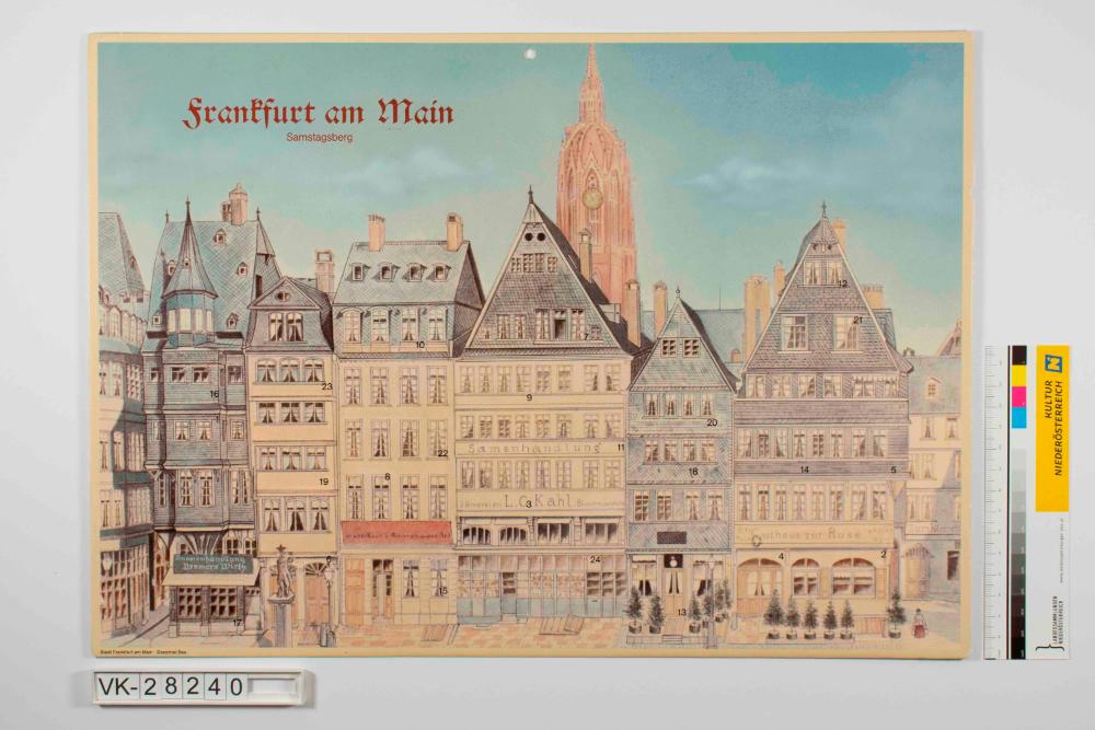 Hängeadventkalender, Querformat mit mittiger Aufhängelochung oben; Darstellung Hausfassade Frankfurt am Main, Samstagsberg vor blauem Himmel; viereckige Türchen; links unten Herkunftsangaben; ein weiteres Exemplar dieses Kalenders unter VK-28241 vorhanden.