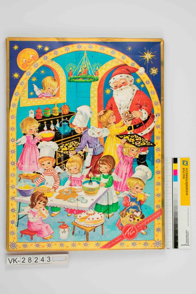 Fülladventkalender mit Schokolade, Hochformat, zum Aufstellen oder Hängen; aufgestellt laut Anleitung als Lichtspiel mit Kerze verwendbar; mit Kunststoffeinschub; weihnachtliche Backstube mit vielen kindlichen Engelchen und Weihnachtsmann; über der Szenerie Adventkranz mit vier brennenden Kerzen; eingerahmt durch gelbes Torbogenmotiv mit Sternenornament; rechts unten Logo Original Pea Adventskalender; rückseitig Beschreibung zur Handhabung, eingeklappte Aufhänge- bzw. gestanzte Aufstellvorrichtung; Zutatenliste, Nummer 773-3, Firma Petzold und Aulhorn, Hamburg; hergestellt in WestDeutschland.