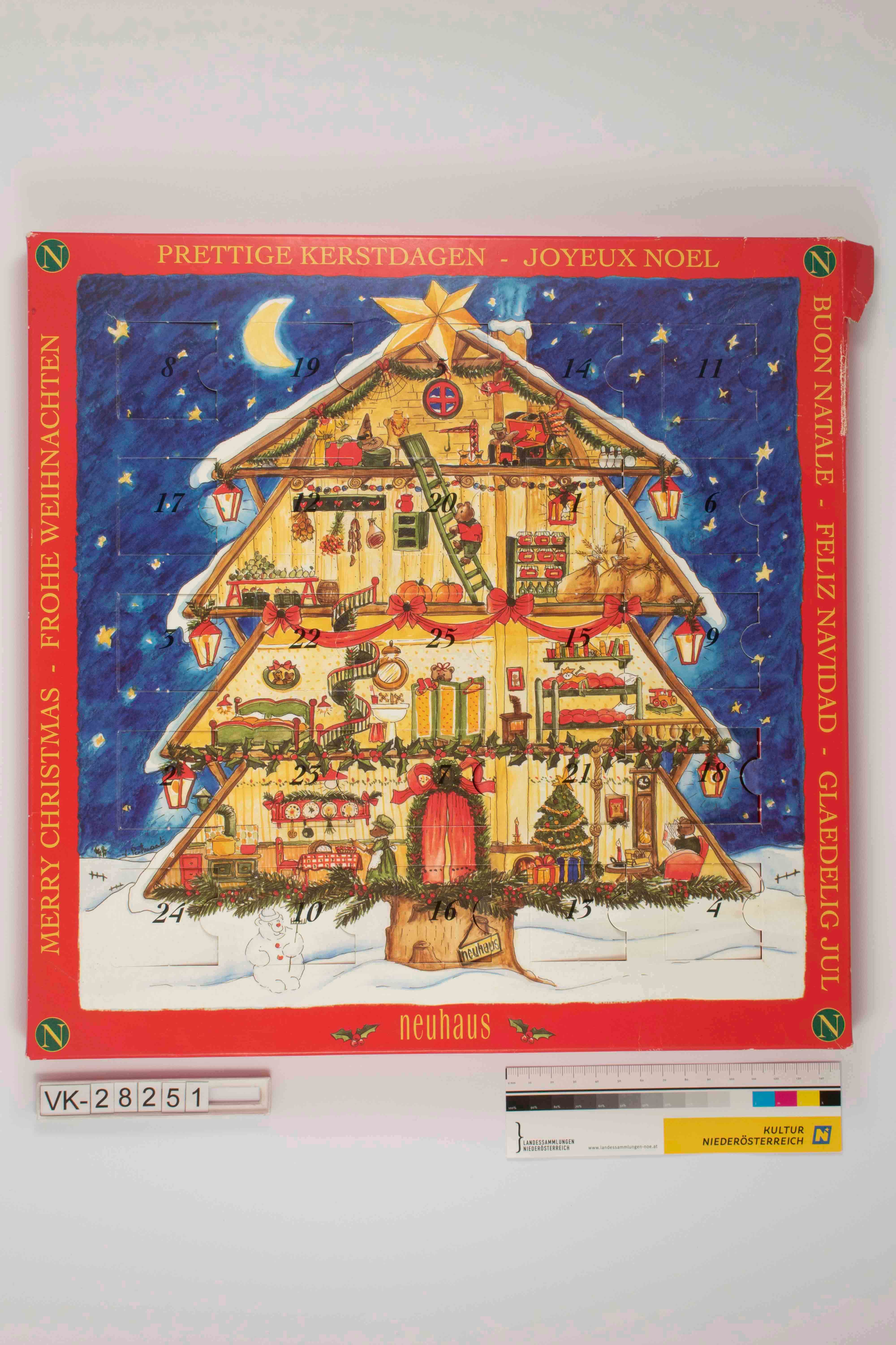 Fülladventkalender mit Kunststoffeinschub; rot umrahmte Profildarstellung eines auseinandergeschnittenen Tannenbaumes mit vier Geschoßen und Wohnräumen in welchen sich Bären aufhalten; alles weihnachtlich dekoriert, Landschaft winterlich verschneit mit dunkelblauem Sternenhimmel; Weihnachtsglückwünsche in der Umrahmung in unterschiedlichen Sprachen; Adventkalender der Schokoladefirma Neuhaus, Firmenlogo in allen vier Ecken; rückseitig Zutatenlisten und Herkunftsangaben.