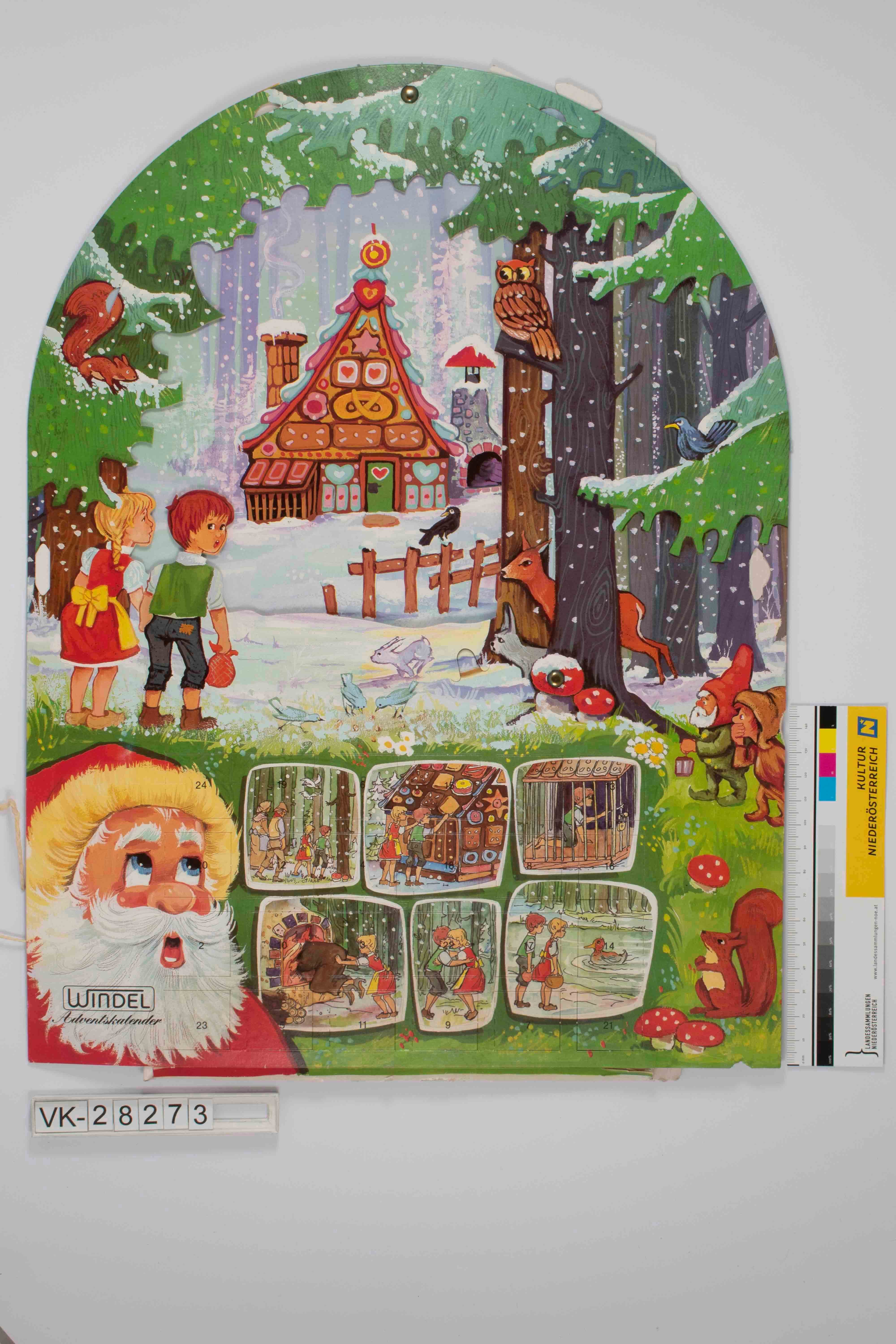 Dreidimensionaler, beweglicher Fülladventkalender zum Hängen mit Märchendarstellung Hänsel und Gretel; Hänsel und Gretel in verschneiter Waldkulisse mit Waldtieren, dahinter Lebkuchenhaus mit ins Bild beweglicher Hexe; Hexe durch Schnur bewegbar; im unteren Drittel Weihnachtsmann sowie Märchenszenen und quadratische Türchen mit Schokoladefüllung; links unten Beschriftung Windel Adventkalender; rückseitig Abdruck des Liedes Hänsel und Gretel mit Noten in C-Dur und Herkunftsangaben.