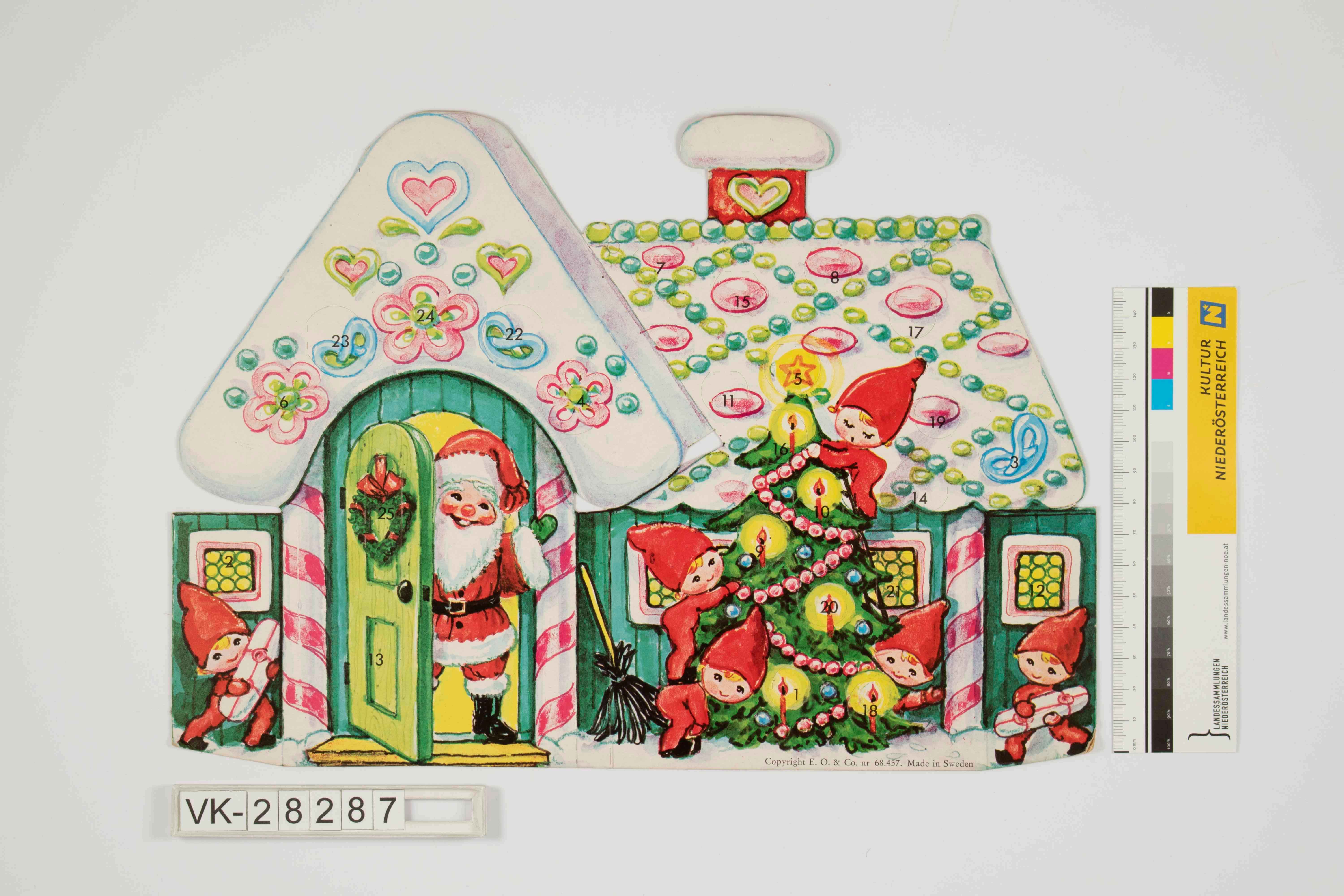 Hängeadventkalender, Querformat, in Form eines grünen Knusperhäuschens mit aus der Tür winkendem Weihnachtsmannes und rot gekleideten und -bemützten Wichteln welche einen Christbaum schmücken und Packerl bringen; runde Türchen am Dach verteilt und rechteckige in den Fenstern und der Tür; rechts unten Herkunftsangaben sowie die Nummer 68 457.