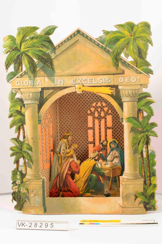Dreidimensionale Kartonkrippe mit lichtdurchlässigen Fenstern; klassischer Tempel mit der Aufschrift „Gloria in Excelsis Deo!“, umrahmt von Palmen; gotisch anmutende, mit rosa Seidenpapier hinterklebte, durchscheinende Fenster; Krippenszene mit Heiliger Familie und Drei Königen welche das Jesuskind anbeten und Gaben darbringen; unter dem Tympanon angenieteter, beweglicher Stern.