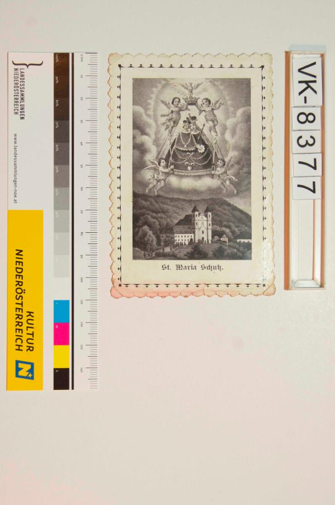 Maria mit Jesuskind, Kirche Maria Schutz, Engel; Rückseite: handschr. "Mürzzuschlag 28.8.98", "Memorare, o pissima Virgo."