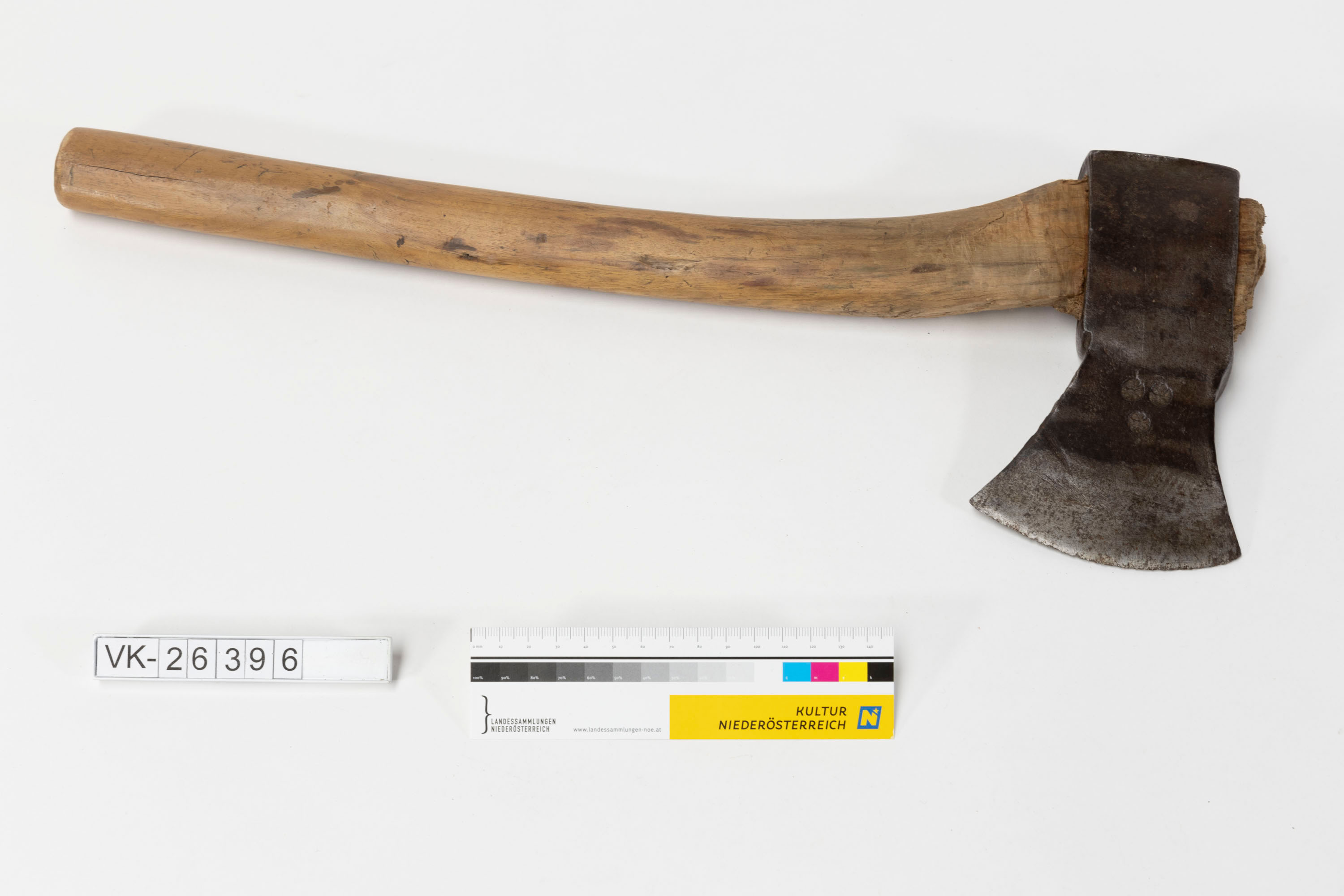 Kleine Axt mit nach unten hin breiter werdendem Blatt und einem Holzstiel.