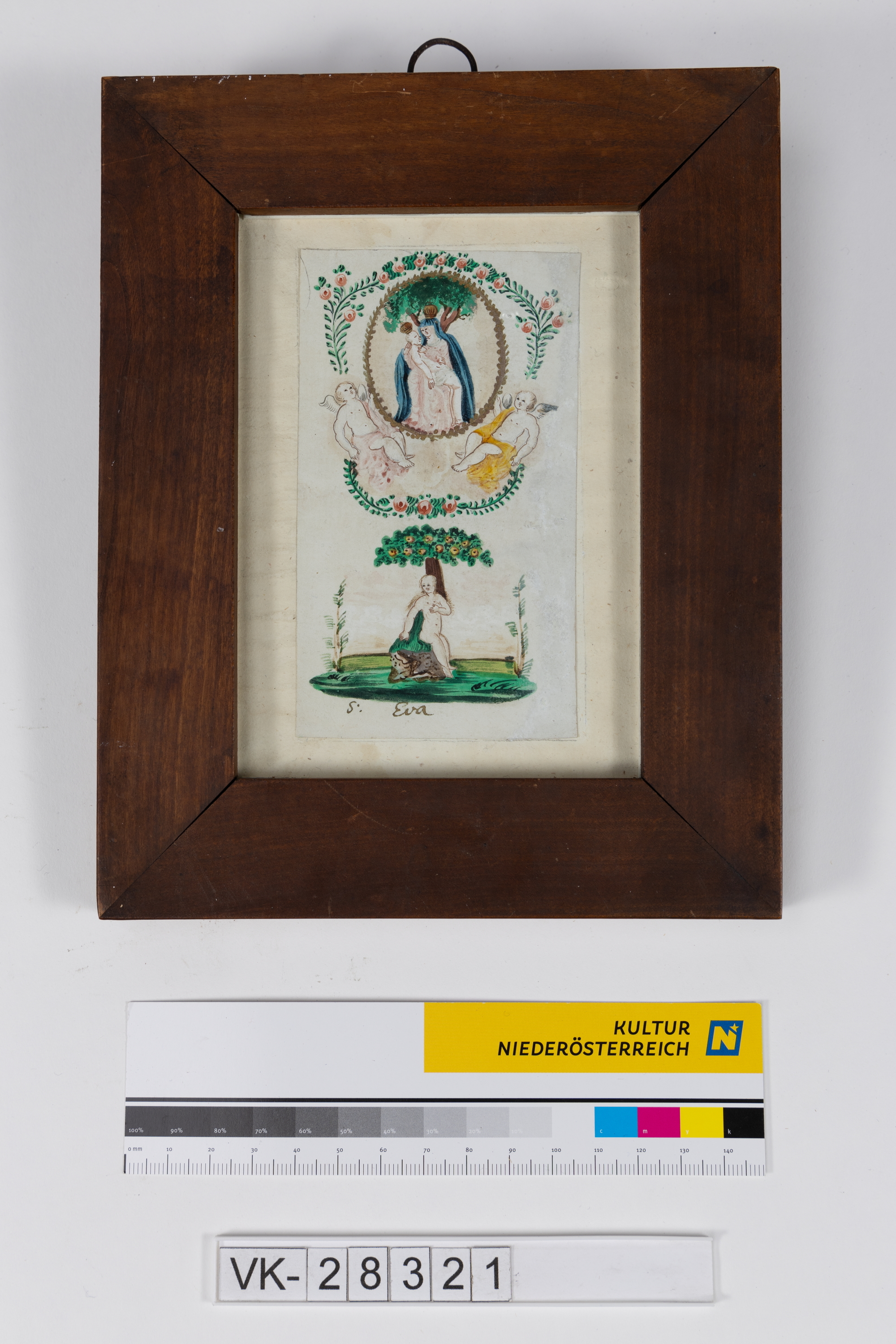 Andachtsbildchen mit Gnadenbild von Maria Dreieichen, darunter Darstellung der Eva. Das Andachtsbildchen ist in einem Holzrahmen hinter Glas auf einen Karton geklebt. Der Rahmen scheint nachgefertigt.