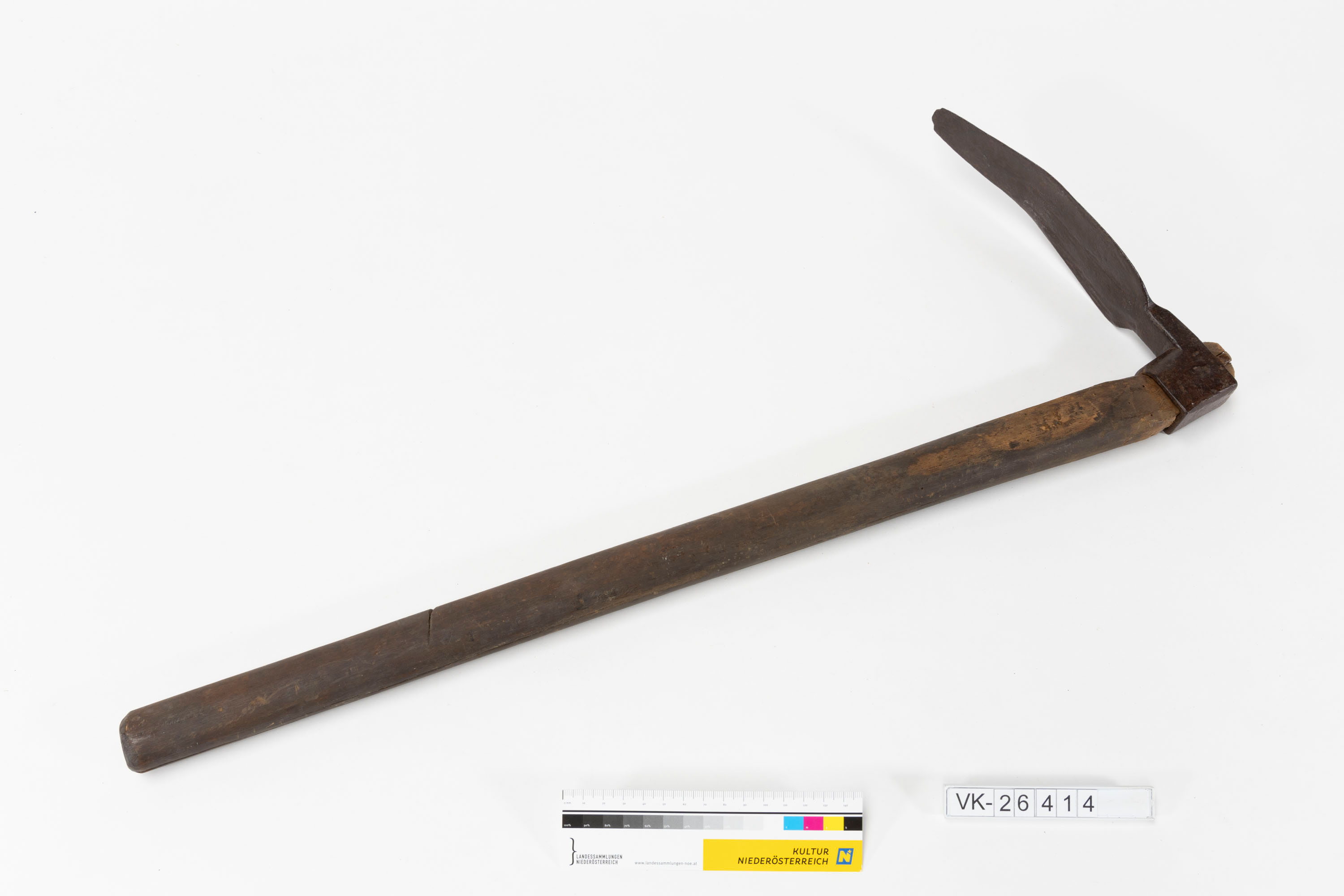 Schmiedeeiserne Haue mit leicht gebogenem, zum runden Abschluss hin verjüngten Blatt und einem Holzstiel.
