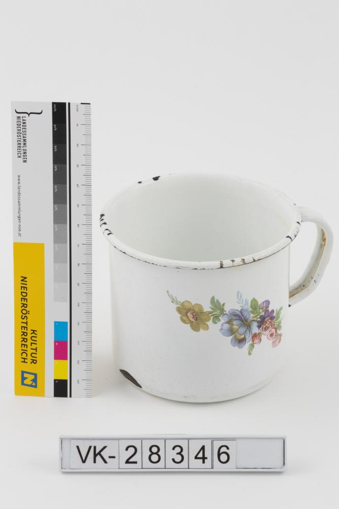 Emailliertes Blechhäferl mit Henkel und einem aufgedruckten Blumenmotiv.