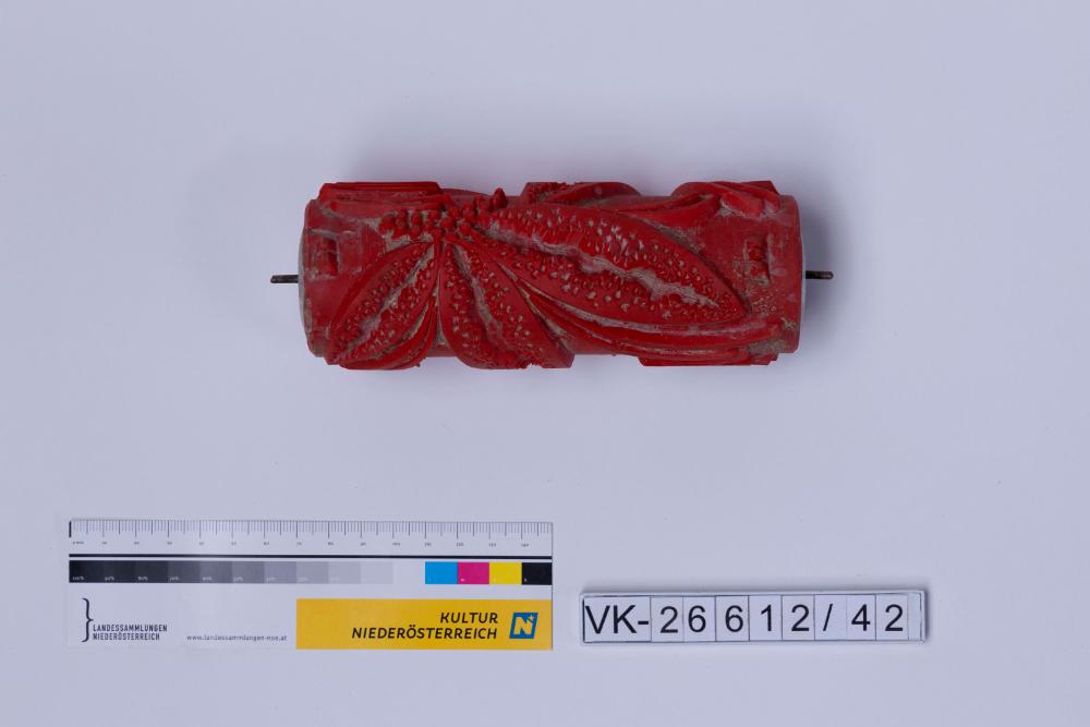 Dekor- bzw. Musterwalze oder Musterrolle mit Holzkern und Positivmuster aus Gummi. Auf der Walze sind Farbreste vorhanden.