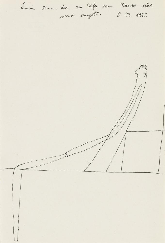 SignaturVS ob. betit., mon., dat.: "Ein Mann, der am Ufer sitzt und angelt. O. T. 1973"