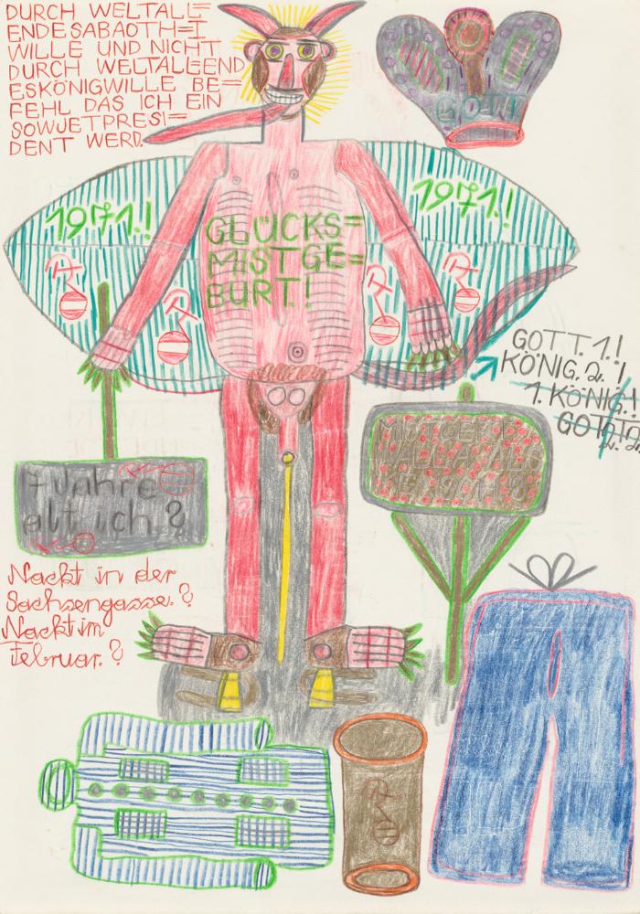 Farbstift, Graphit, Kugelschreiber auf Papier