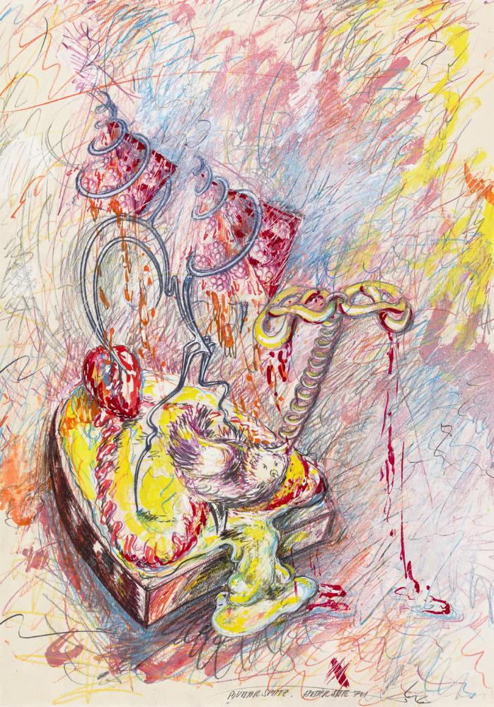 Christian Ludwig Attersee, Butterspatz, Graphit, Farbstift, Aquarell auf Papier, 1974, © Bildrecht, Wien 2025