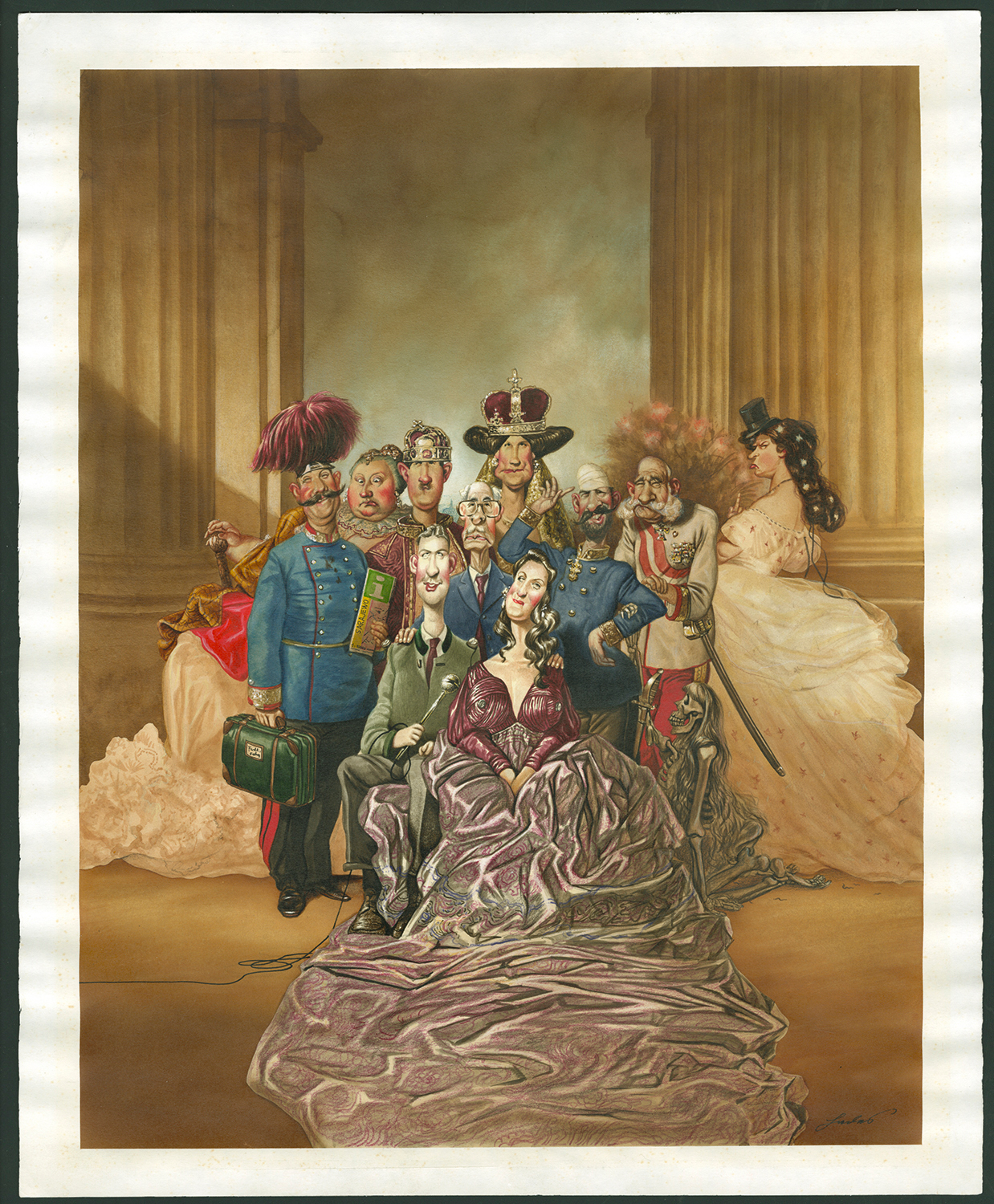 Von links nach rechts: Erzherzog Franz Ferdinand, Kaiserin Maria Theresia, Kaiser Karl I., Otto von Habsburg, Kaiserin Zita, Kronprinz Rudolf, Kaiser Franz Josef I., Kaiserin Elisabeth "Sissi"; vorne: Karl Habsburg und "Chessie" Thyssen-Bornemisza