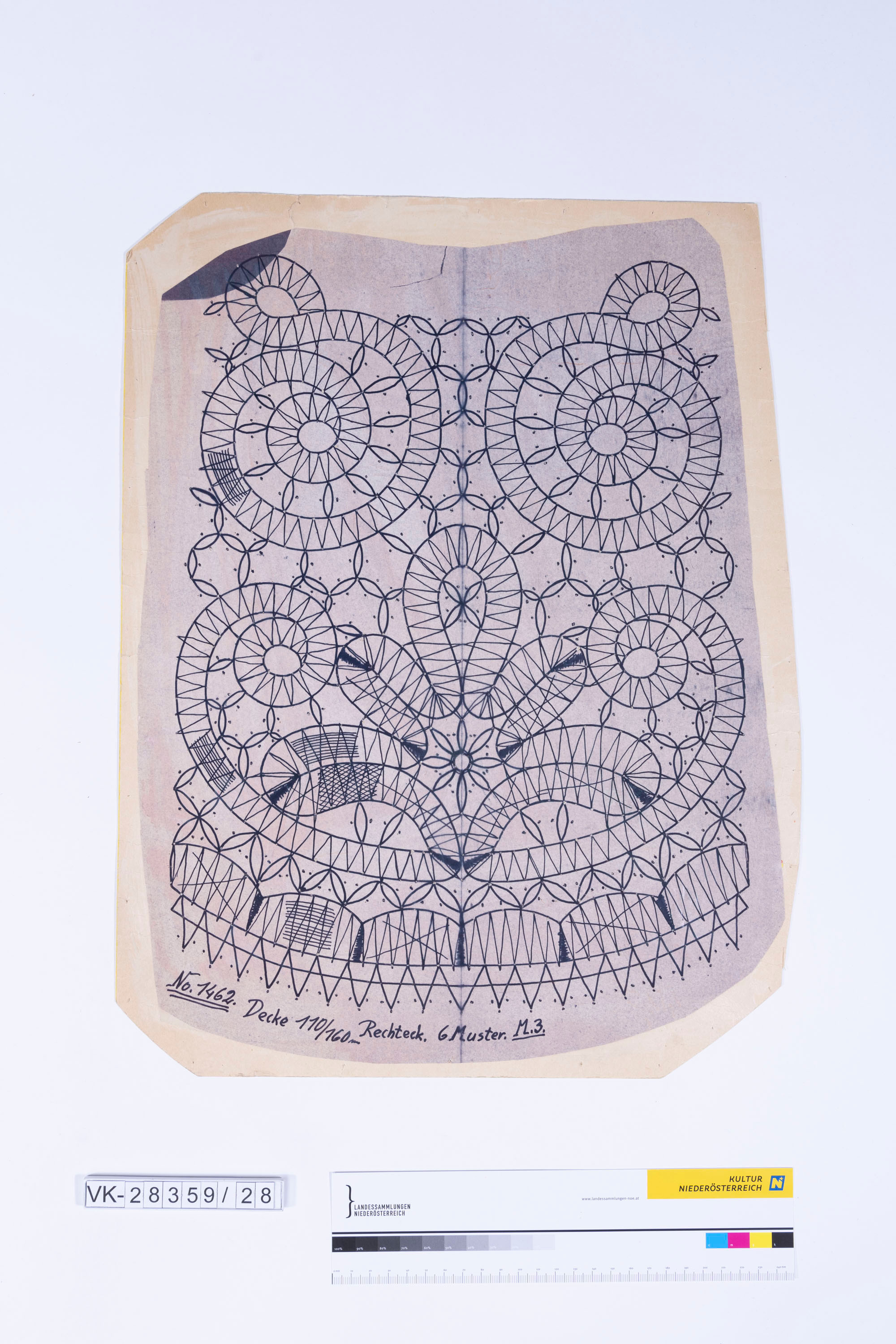 Klöppelbrief mit geschlängeltem Muster; Papierbogen, aufgeklebt auf einen Karton; Aufschrift: "No. 1462. Decke 110/160 cm Rechteck. 6 Muster. M.3."