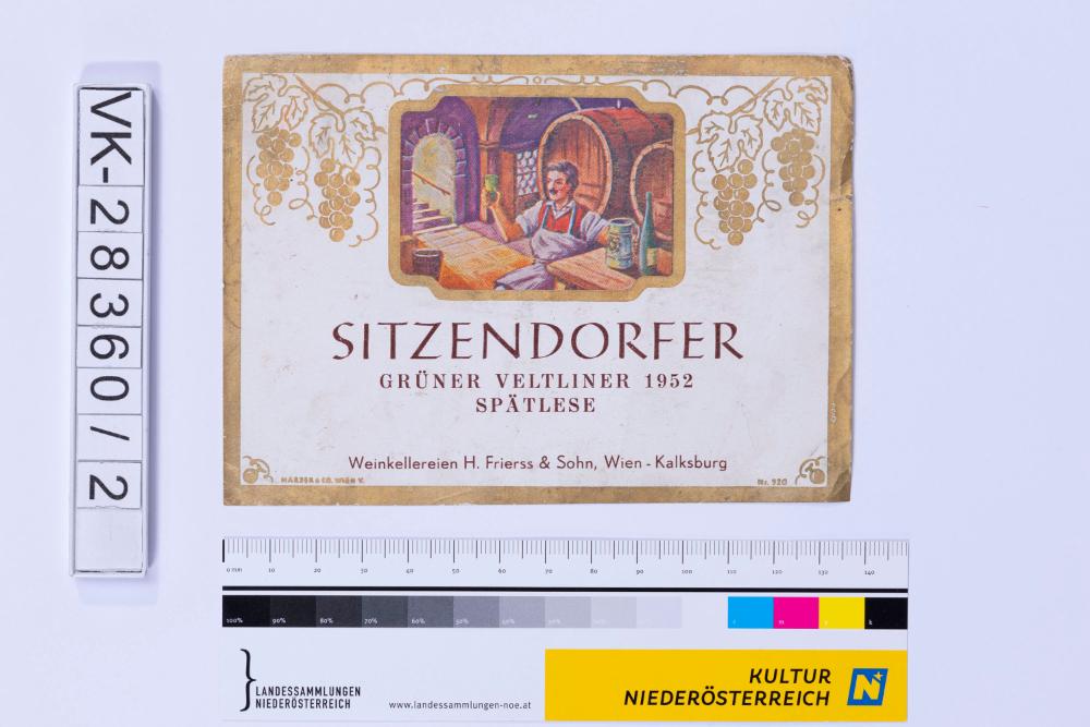 Abgelöstes Weinflaschenetikett aus einer Sammlung von den 1940er bis zu den frühen 1960er Jahren; Weinsorte: "SITZENDORFER GRÜNER VELTLINER 1952 SPÄTLESE", Darstellung eines Mannes im Weinkeller und Weinreben; Weinbau, Kellerei bzw. Handel: "Weinkellerei H. Frierss & Sohn, Wien – Kalksburg"
