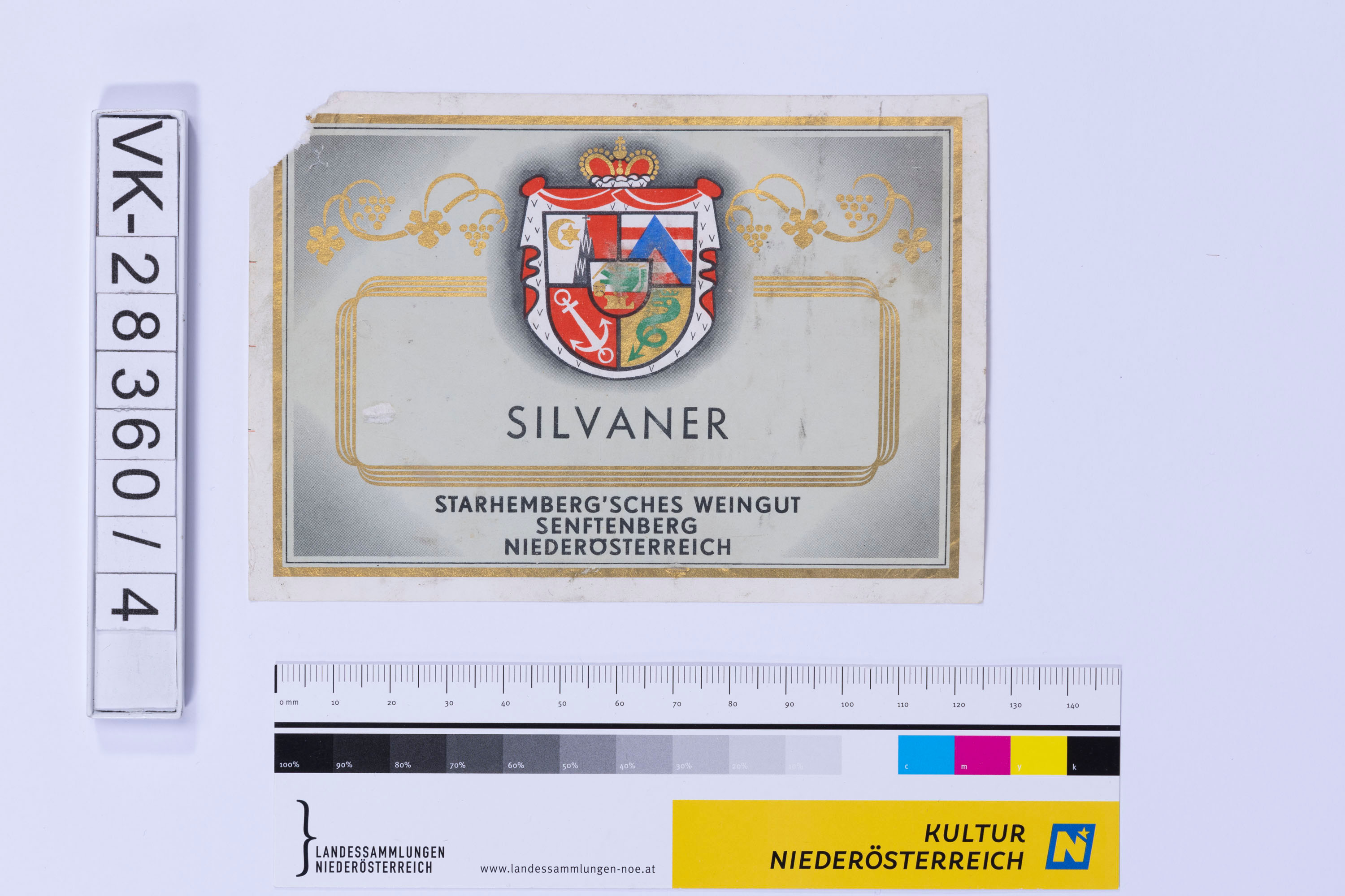 Abgelöstes Weinflaschenetikett aus einer Sammlung von den 1940er bis zu den frühen 1960er Jahren; Weinsorte: "SILVANER", Wappendarstellung mit Weinreben; Weinbau, Kellerei bzw. Handel: "STARHEMBERG'SCHES WEINGUT SENFTENBERG NIEDERÖSTERREICH"