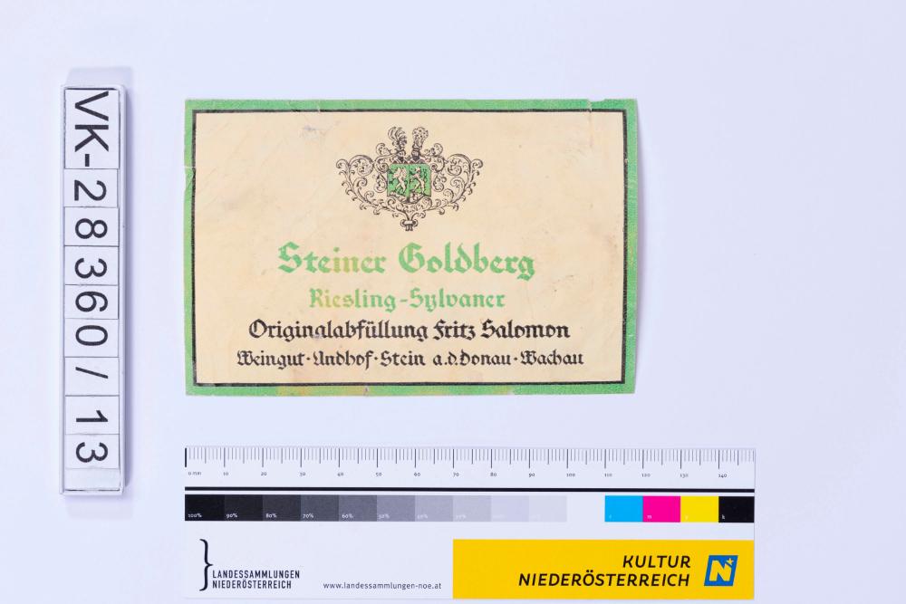 Abgelöstes Weinflaschenetikett aus einer Sammlung von den 1940er bis zu den frühen 1960er Jahren; Weinsorte: "Steiner Goldberg Riesling-Sylvaner", Darstellung von zwei Helmen und zwei Wappen; Weinbau, Kellerei bzw. Handel: "Orginialabfüllung Fritz Salomon Weingut Undhof Stein a.d. Donau Wachau"
