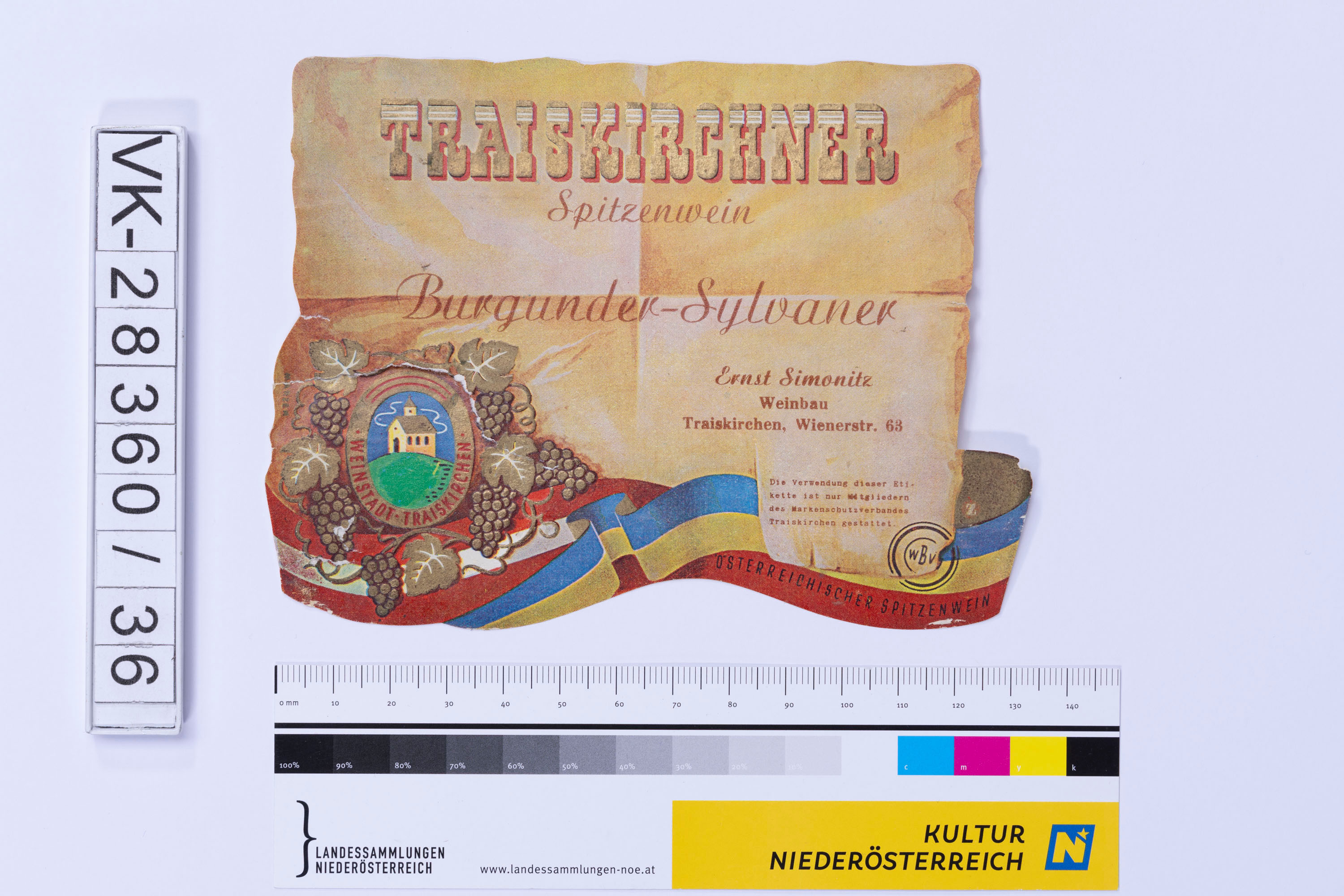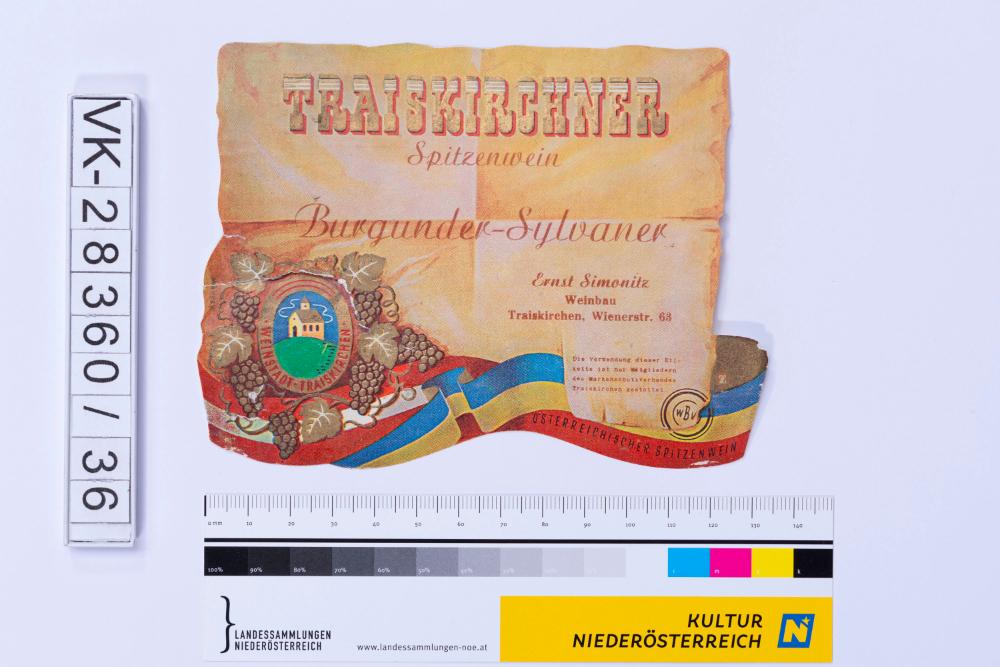 Abgelöstes Weinflaschenetikett aus einer Sammlung von den 1940er bis zu den frühen 1960er Jahren; Weinsorte: "TRAISKIRCHNER Spezialwein Burgunder-Sylvaner", Wappendarstellung mit Kirche und Inschrift "WEINSTADT TRAISKIRCHEN", eingerahmt von Weinreben; Weinbau, Kellerei bzw. Handel: "Ernst Simonitz Weinbau Traiskirchen, Wienerstr. 63"; Markenschutz "Die Verwendung dieser Etikette ist nur Mitgliedern des Markenschutzverbandes Traiskirchen gestattet."