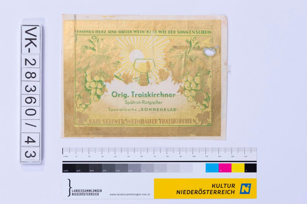 Abgelöstes Weinflaschenetikett aus einer Sammlung von den 1940er bis zu den frühen 1960er Jahren; Weinsorte: "Orig. Traiskirchner Spätrot-Rotgipfler Spezialmarke "SONNENKLAR", Beschriftung "FROHES HERZ UND GUTER WEIN-KLAR WIE DER SONNENSCHEIN"; Darstellung eines Weinglases mit einer Sonne, eingerahmt von Weinreben; Weinbau, Kellerei bzw. Handel: "KARL SEIFNER WEINHAUER TRAISKIRCHEN"