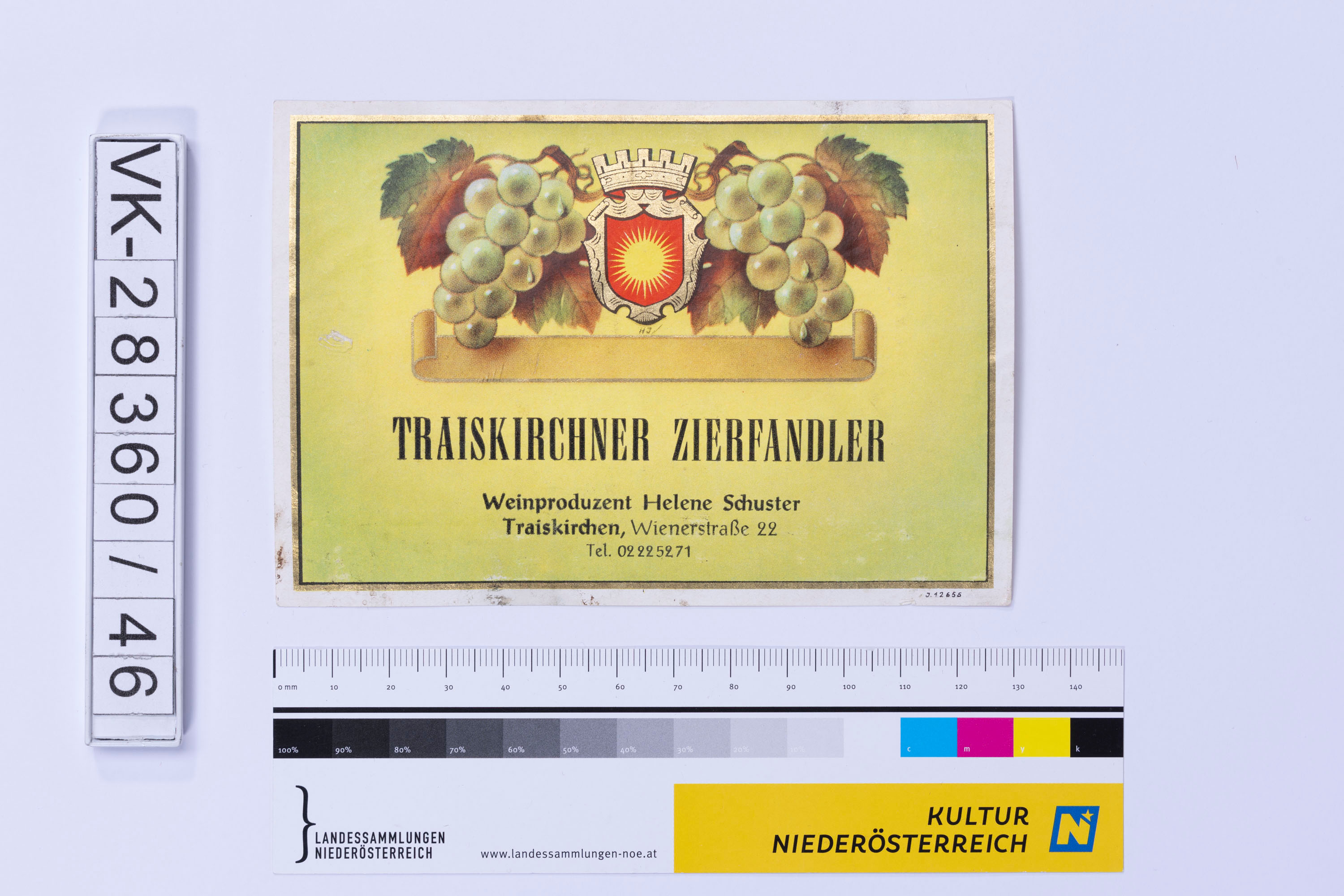 Abgelöstes Weinflaschenetikett aus einer Sammlung von den 1940er bis zu den frühen 1960er Jahren; Weinsorte: "TRAISKIRCHNER ZIERFANDLER", Wappendarstellung mit Weinreben; Weinbau, Kellerei bzw. Handel: "Weinproduzent Helene Schuster Traiskirchen, Wienerstraße 22 Tel. 02225271"