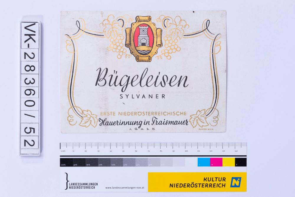 Abgelöstes Weinflaschenetikett aus einer Sammlung von den 1940er bis zu den frühen 1960er Jahren; Weinsorte: "Bügeleisen Sylvaner", Wappendarstellung mit Burg und Weinreben; Weinbau, Kellerei bzw. Handel: "ERSTE NIEDERÖSTERREICHISCHE Hauerinnung in Traismauer r.G.m.b.H."