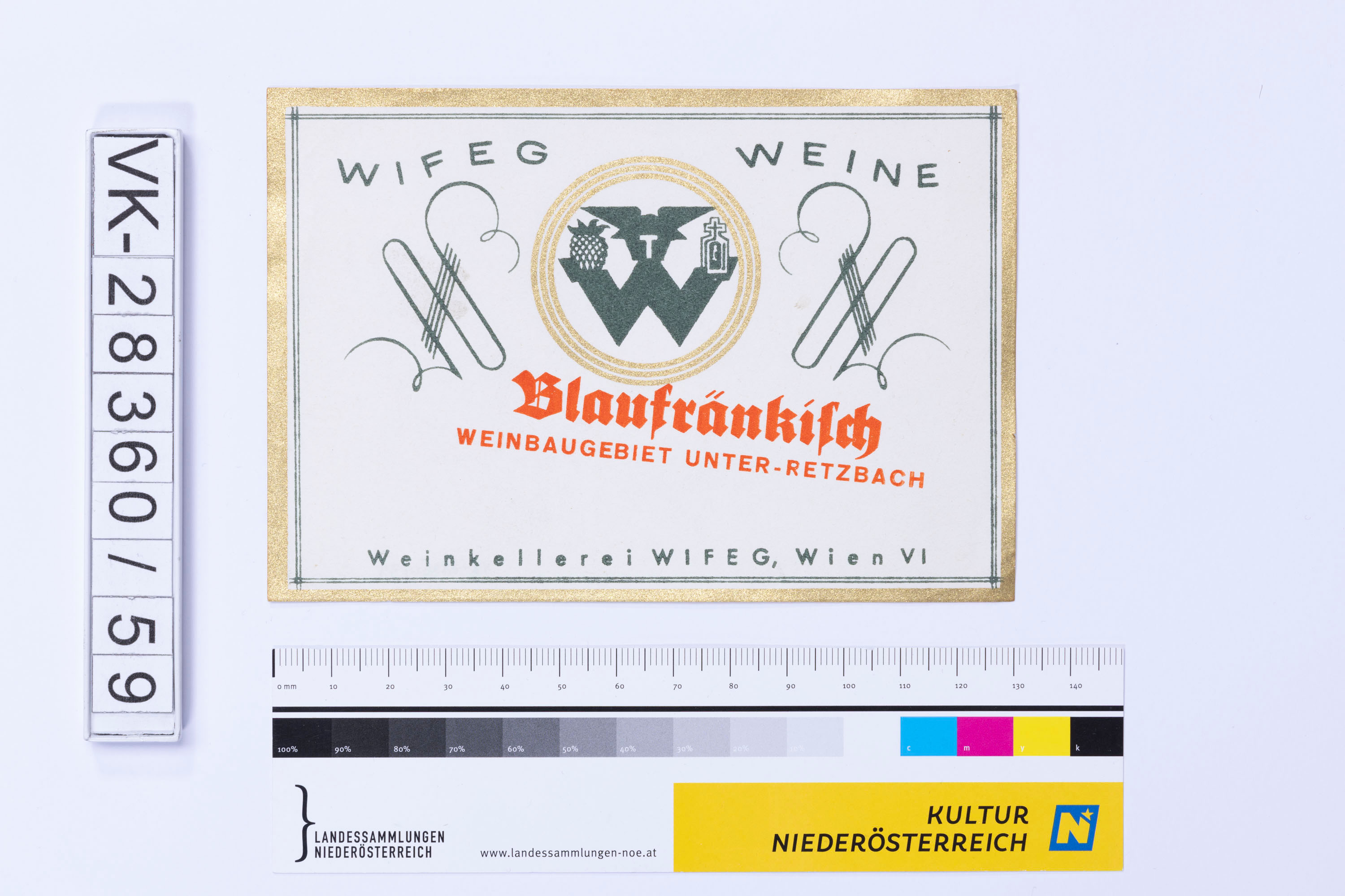 Abgelöstes Weinflaschenetikett aus einer Sammlung von den 1940er bis zu den frühen 1960er Jahren; Weinsorte: "Blaufränkisch", Beschriftung "WEINBAUGEBIET UNTER-RETZBACH", Markenzeichen; Weinbau, Kellerei bzw. Handel: "WIFEG WEINE Weinkellerei WIFEG, Wien VI"