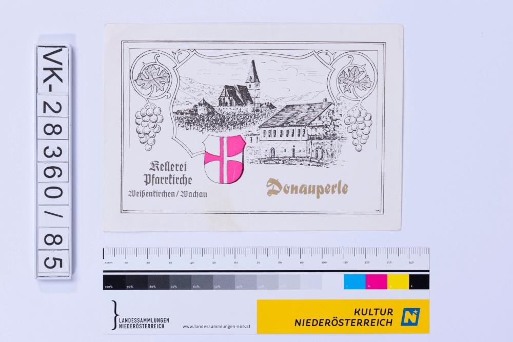 Abgelöstes Weinflaschenetikett aus einer Sammlung von den 1940er bis zu den frühen 1960er Jahren; Weinsorte: "Donauperle", Darstellung von einem Dorf mit Wappen und Weinreben; Weinbau, Kellerei bzw. Handel: "Kellerei Pfarrkirche Weißenkirchen/Wachau"