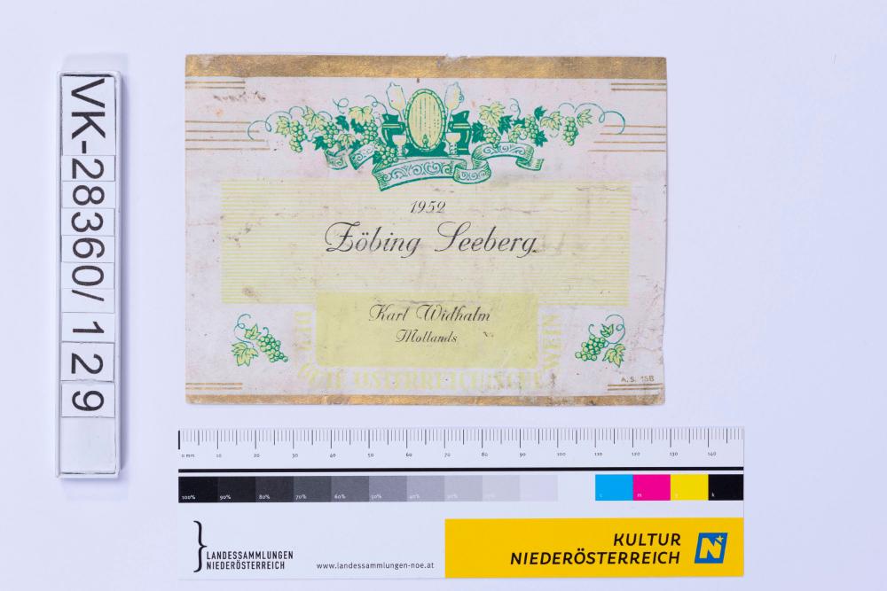 Abgelöstes Weinflaschenetikett aus einer Sammlung von den 1940er bis zu den frühen 1960er Jahren; Weinsorte: "Zöbing Seeberg", Darstellung von einem Weinfass, Weingläsern,- krügen und -reben; Weinbau, Kellerei bzw. Handel: "Karl Widhalm Mollands"