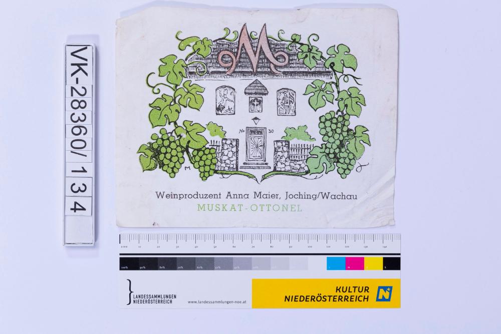 Abgelöstes Weinflaschenetikett aus einer Sammlung von den 1940er bis zu den frühen 1960er Jahren; Weinsorte: "MUSKAT-OTTONEL", Darstellung von einem Haus mit Weinreben; Weinbau, Kellerei bzw. Handel: "Weinproduzent Anna Maier, Joching/Wachau"
