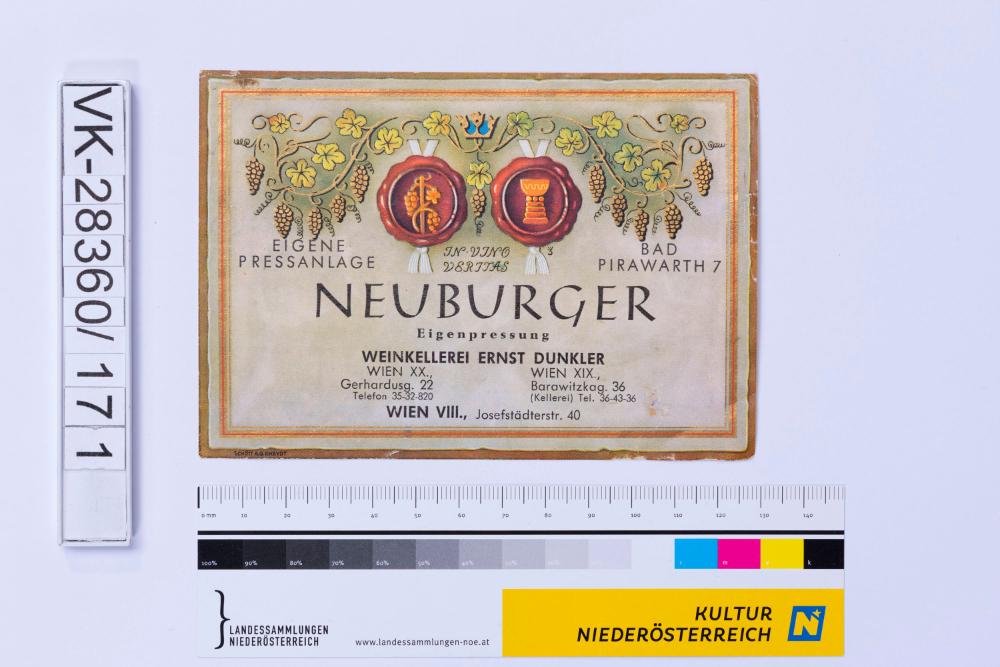 Abgelöstes Weinflaschenetikett aus einer Sammlung von den 1940er bis zu den frühen 1960er Jahren; Weinsorte: "NEUBURGER", Darstellung von zwei Siegeln mit Weinreben und Beschriftung; Weinbau, Kellerei bzw. Handel: "WEINKELLEREI ERNST DUNKLER"
