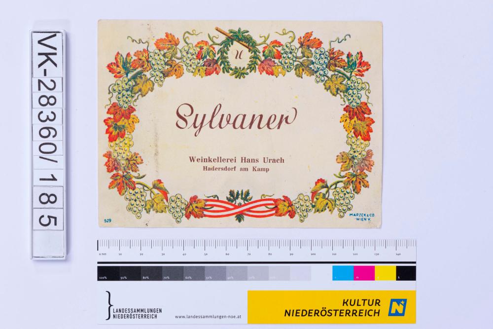 Abgelöstes Weinflaschenetikett aus einer Sammlung von den 1940er bis zu den frühen 1960er Jahren; Weinsorte: "Sylvaner", Darstellung von Weinreben; Weinbau, Kellerei bzw. Handel: "Weinkellerei Hans Urach Hadersdorf am Kamp"