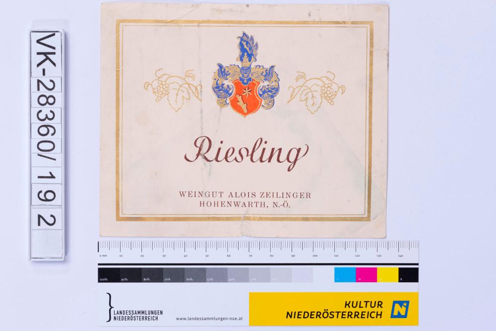 Abgelöstes Weinflaschenetikett aus einer Sammlung von den 1940er bis zu den frühen 1960er Jahren; Weinsorte: "Riesling", Wappendarstellung mit Helm und Weinreben; Weinbau, Kellerei bzw. Handel: "WEINGUT ALOIS ZEILINGER HOHENWARTH, N.-Ö."